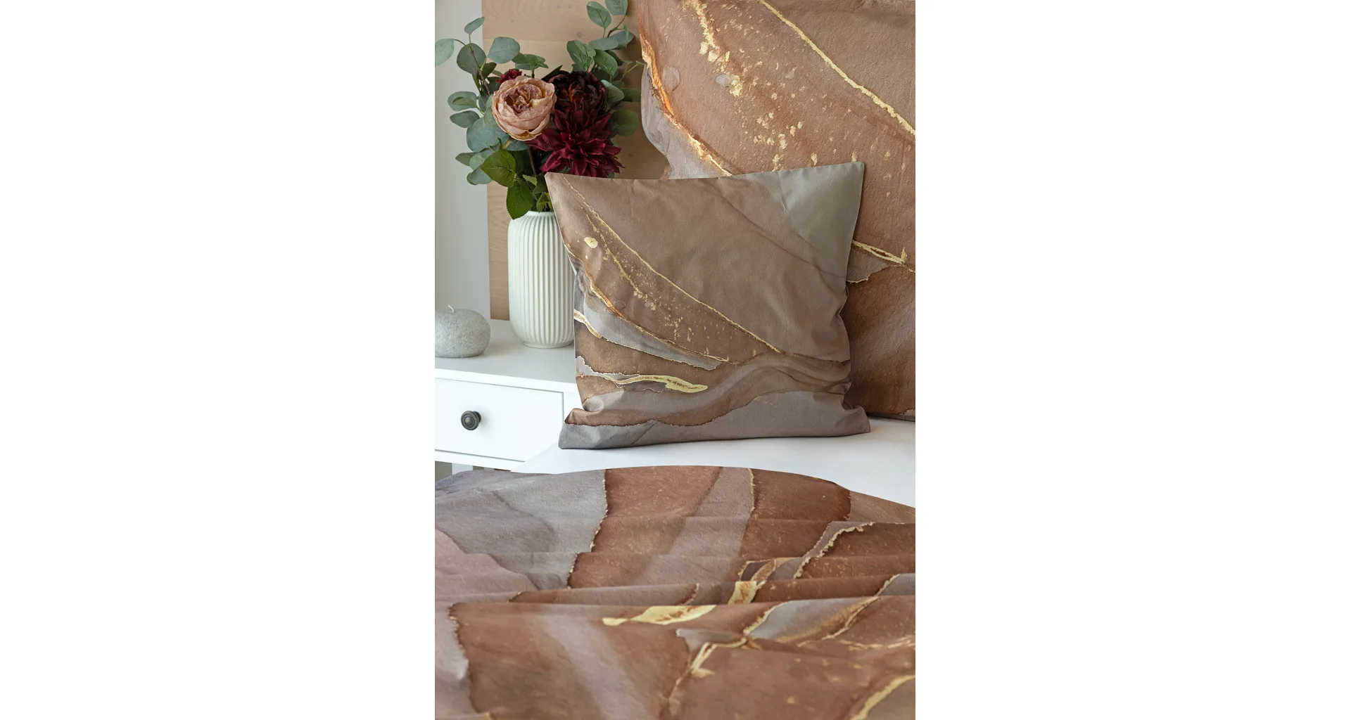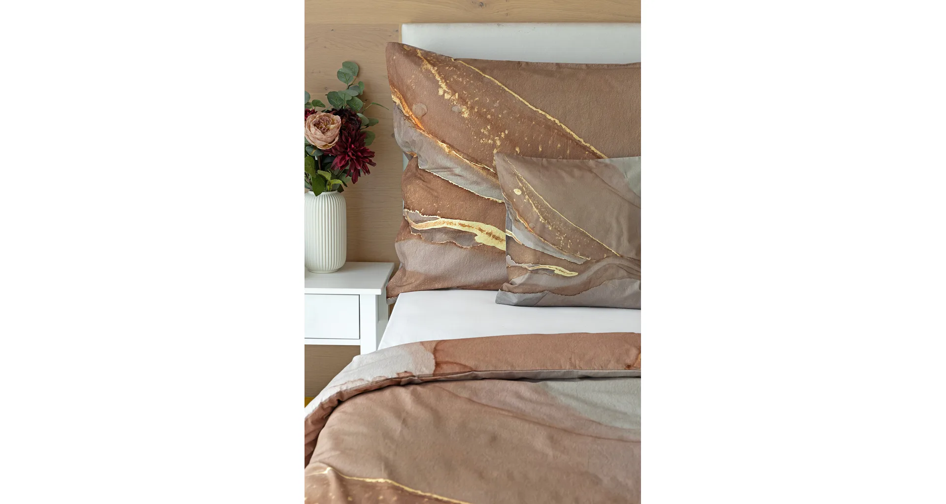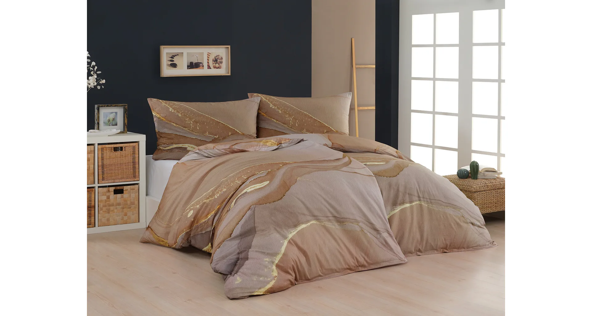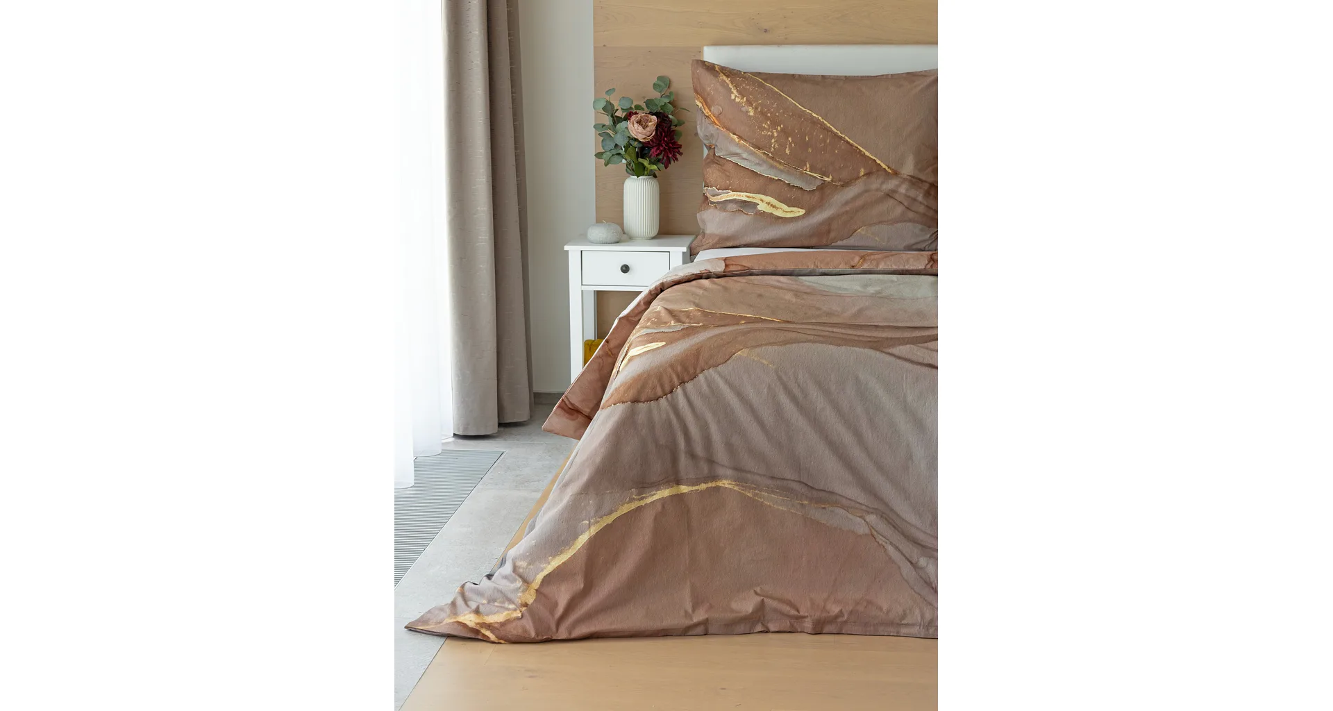 Bavlnené obliečky Riana vnesú do vašej spálne jedinečný štýl a eleganciu. Abstraktný vzor kombinuje paletu hnedých a šedohnedých tónov pretnutých zlatistou linkou. Obliečky sú vyrobené zo 100% prvotriednej bavlny a prinášajú nie len estetickú hodnotu, ale aj výnimočný komfort.
