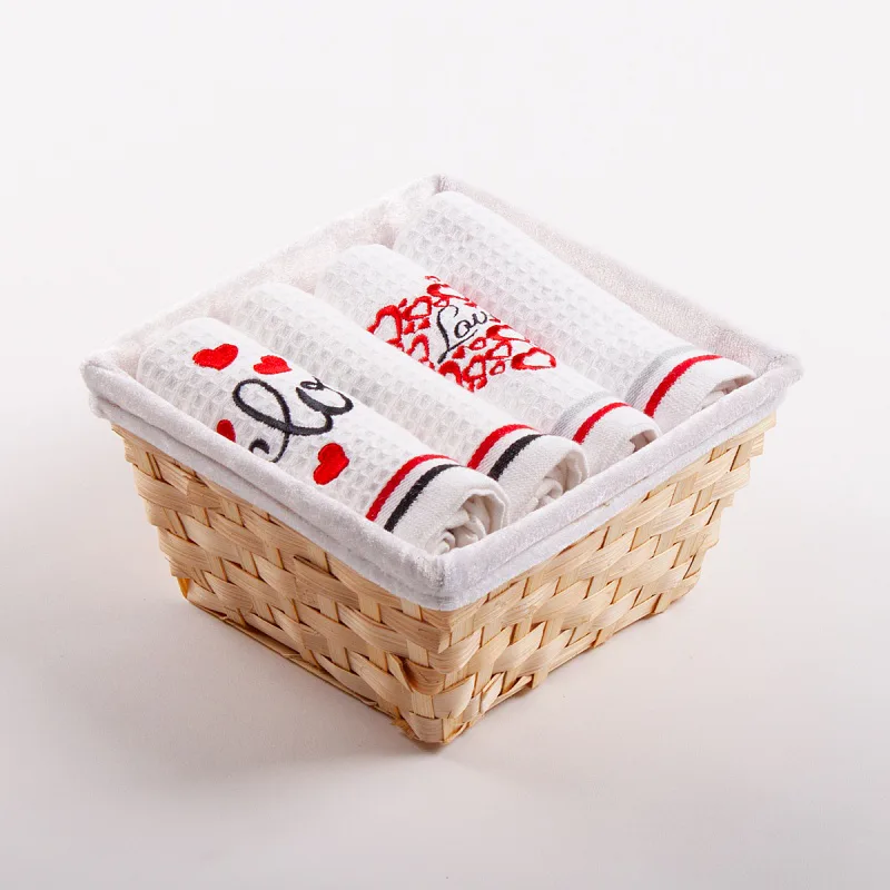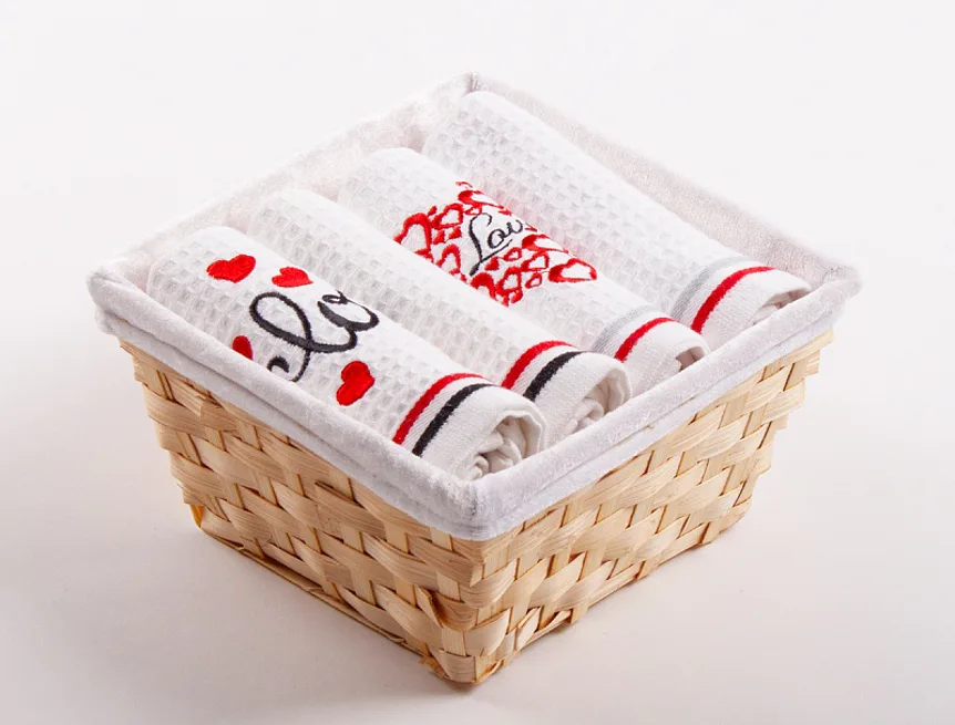 Prútený košík s textilnou vložkou je súčasťou celého balenia, spoločne s utierkami je zabalený v celofáne a doplnený ozdobnou mašľou.