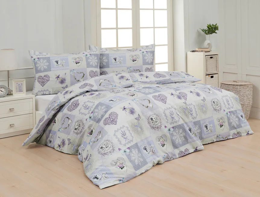 Romantické bavlnené obliečky Rosea v štýle provencie vnesú do vašej spálne sviežu atmosféru. Nápaditý patchwork, kde sa prelínajú typické stredomorské symboly, je ladený do odtieňov prírodne béžovej a pastelovo fialovej farby.