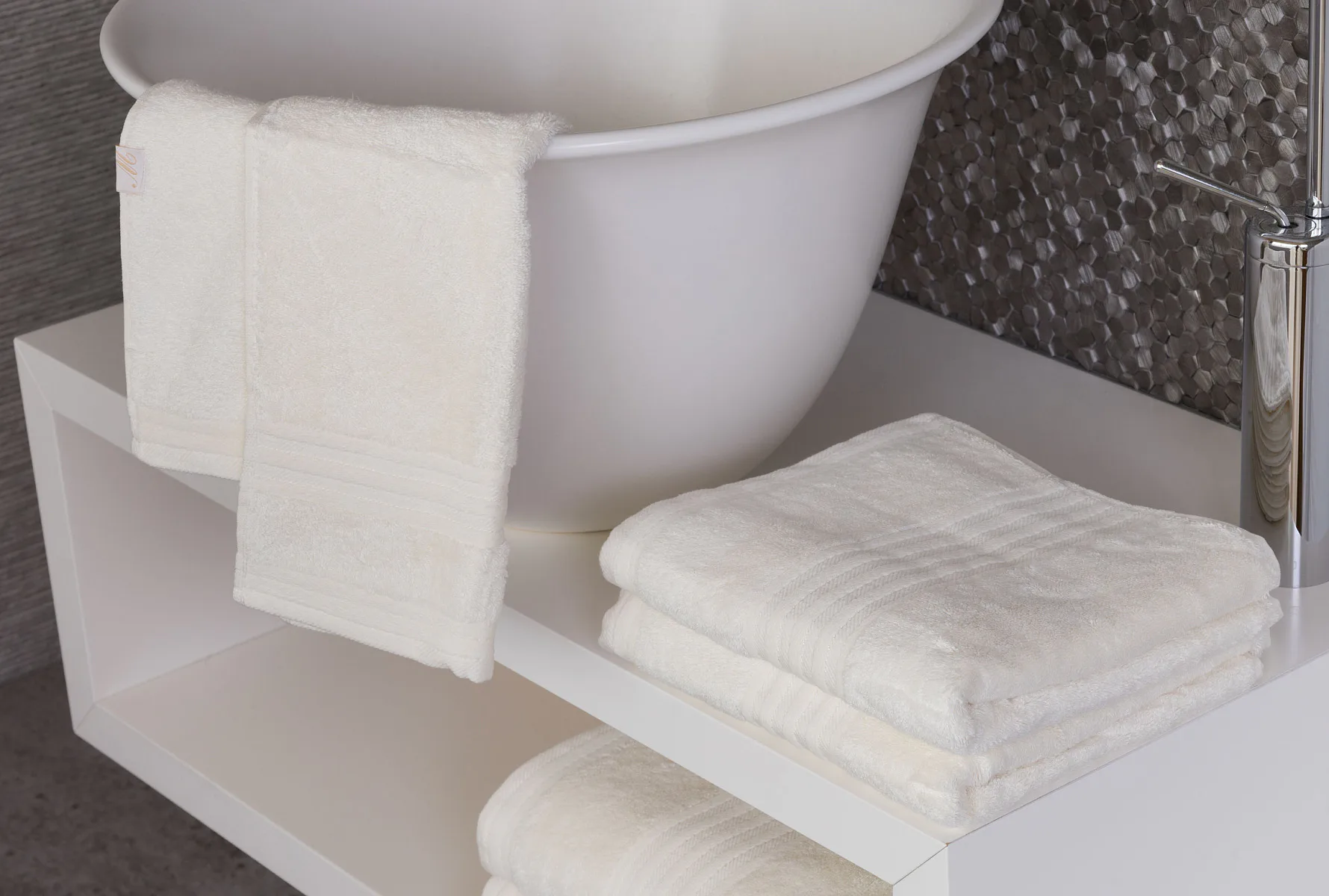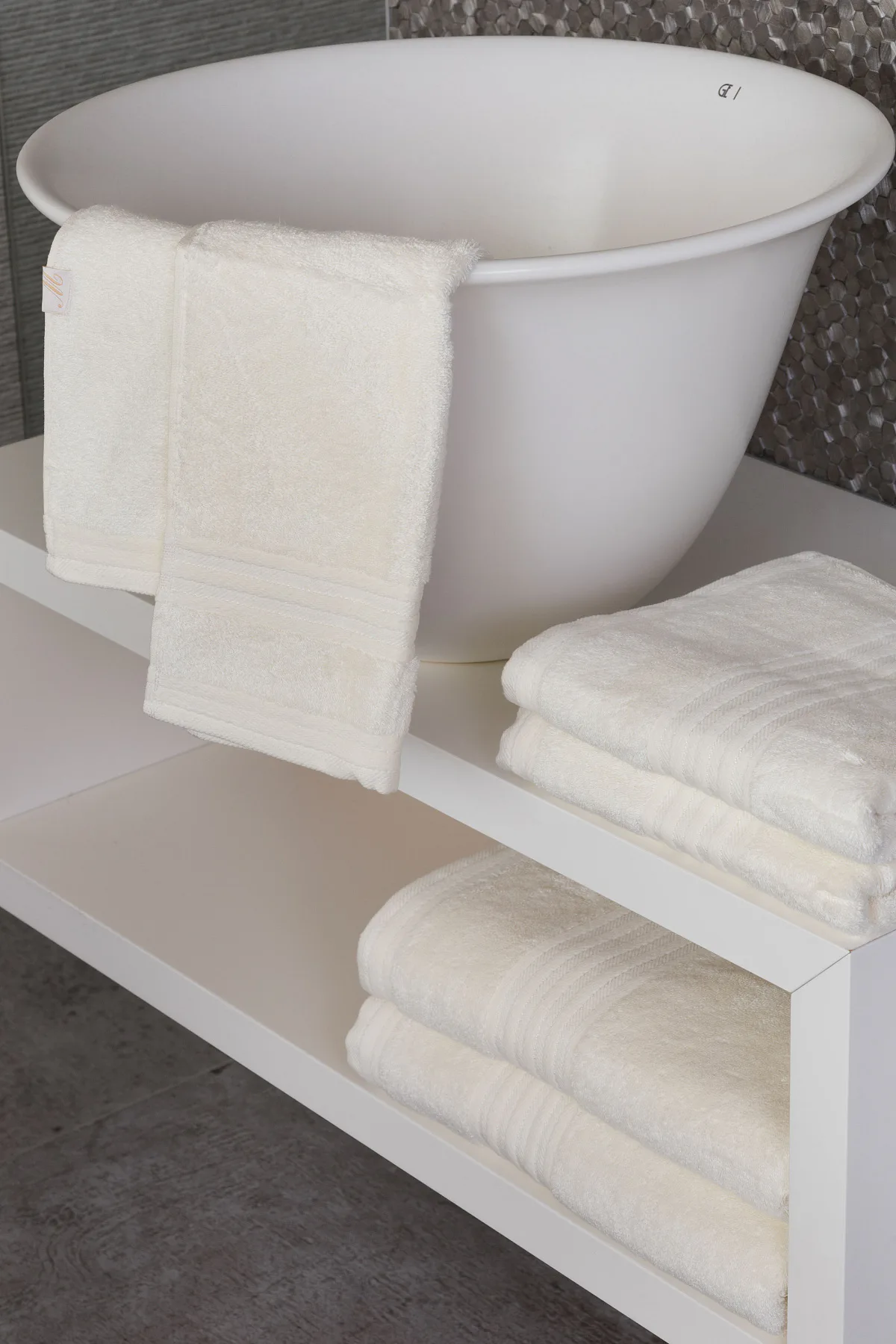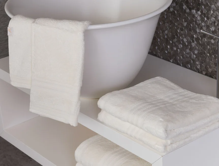 Vybírejte ze tří okouzlujících barev, které působivě doladí interiér vaší koupelny: krémová, béžová a hnědá. Kolekci zdobí decentní bordura tvořená vytkávanými proužky.