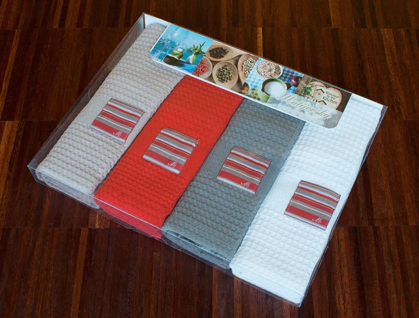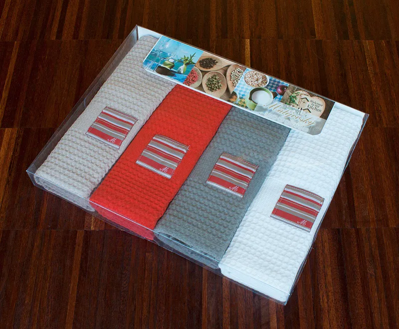 Elegantní kolekce kuchyňských utěrek v podání moderního dezénu NESSA. Utěrky jsou vyrobeny z prémiových bavlněných přízí (egyptské bavlny), zpracovány technikou drobné vafle a opatřeny nášivkou. Utěrky jsou vkusně zabalené v transparentní krabičce, ideální jako dárek.