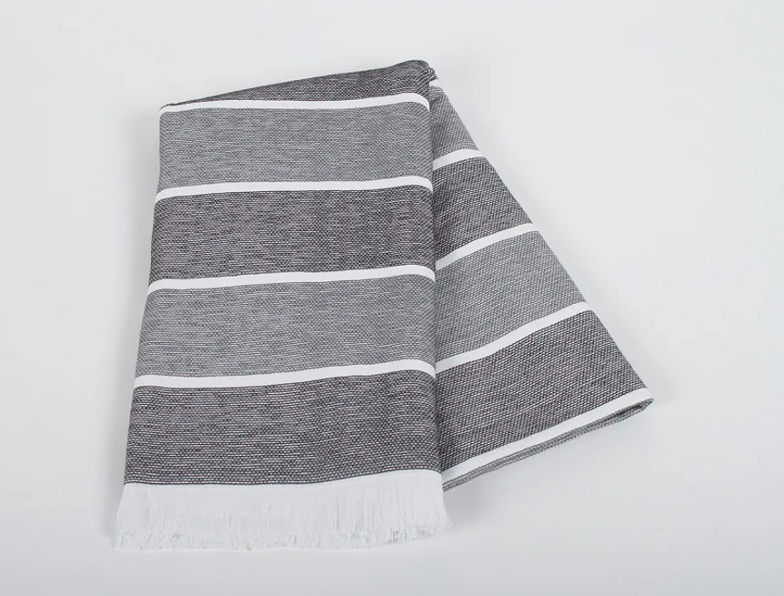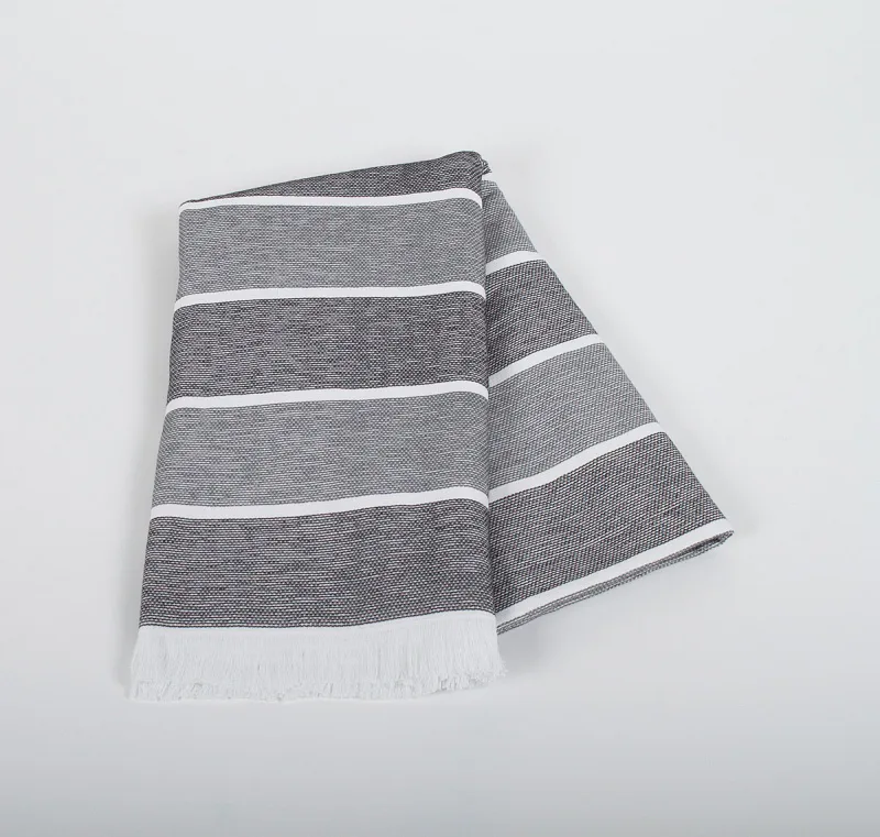 Bavlněná saunová osuška Anika si vás získá moderním designem a hebkým materiálem. Trendy pruhy v odstíhnech černé a šedé protnuté bílým proužkem zpříjemní chvíle aktivního odpočinku. Užijte si saunování i pobyt u vody s tímto praktickým a stylovým doplňkem.