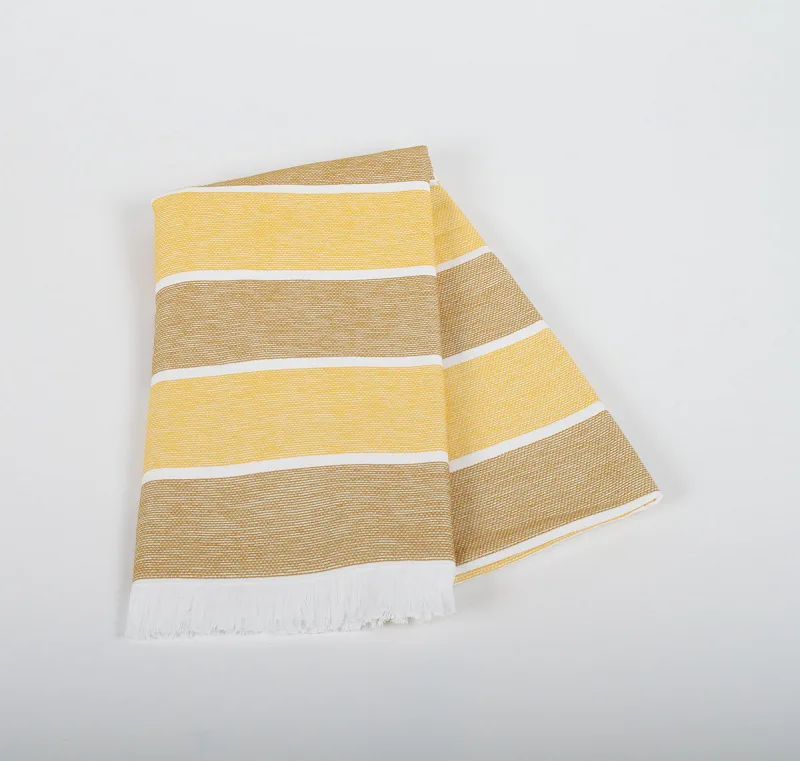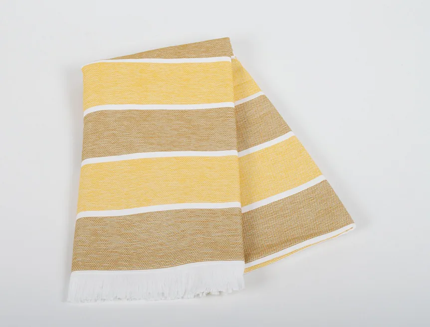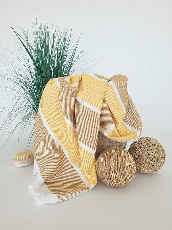 Bavlněná saunová osuška Anika si vás získá moderním designem a hebkým materiálem. Trendy pruhy v odstíhnech medově žluté a medově zlaté protnuté bílým proužkem zpříjemní chvíle aktivního odpočinku. Užijte si saunování i pobyt u vody s tímto praktickým a stylovým doplňkem.