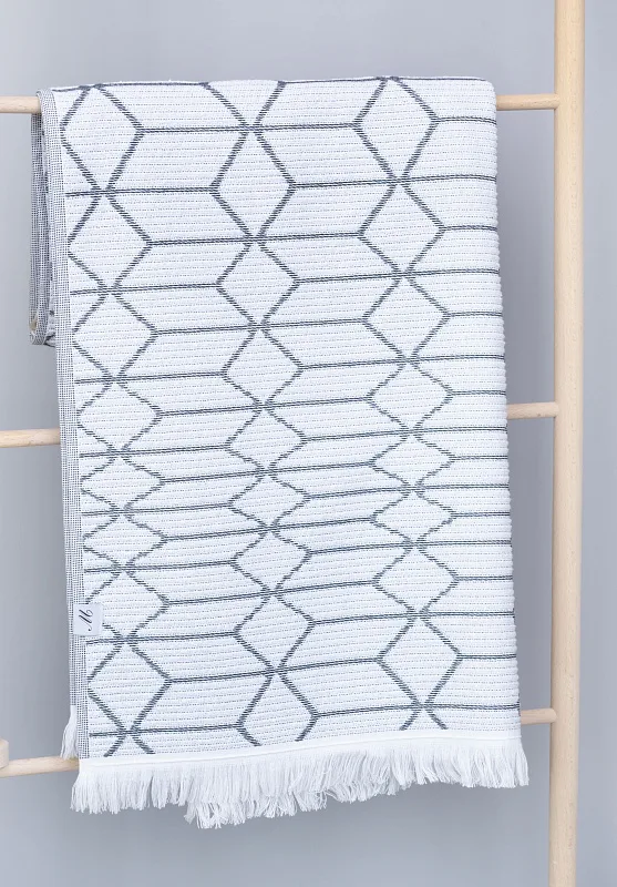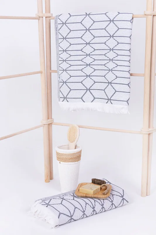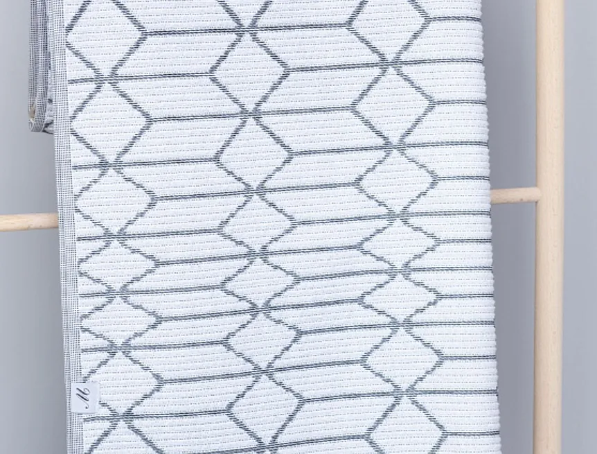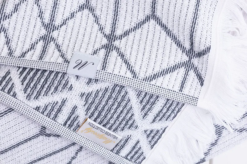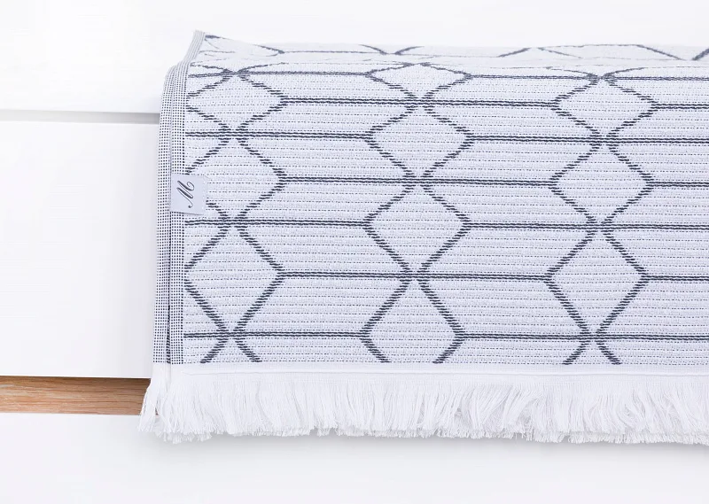 Vytkáváním vzniklo inverzní provedení osušky, která je z jedné strany světlejší a z druhé tmavší. Delší strany osušky jsou olemované a krátké strany zdobí jemné tenké bílé třásně. Poutko pro zavěšení je umístěno na delší straně osušky.