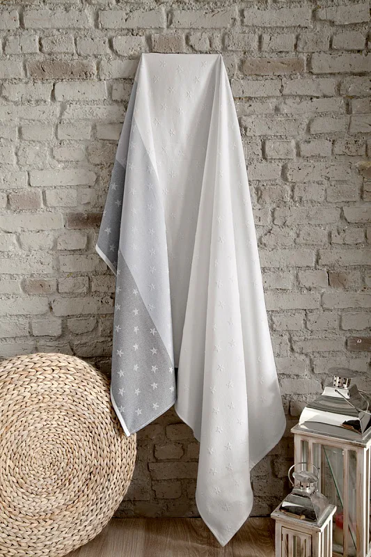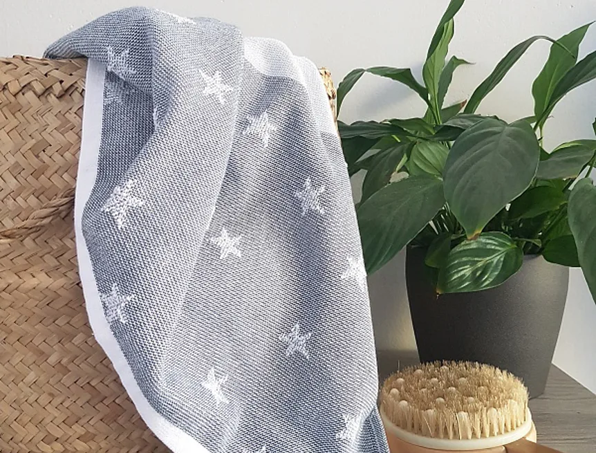 v pastelově šedém a blankytně šedém odstínu. Po celé ploše osušky jsou vytkané decentní bílé hvězdičky. Druhou stranu osušky tvoří jemné bílé froté.