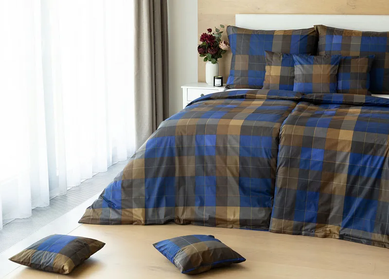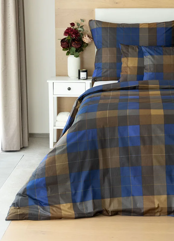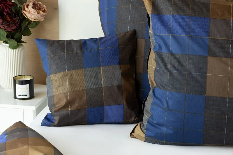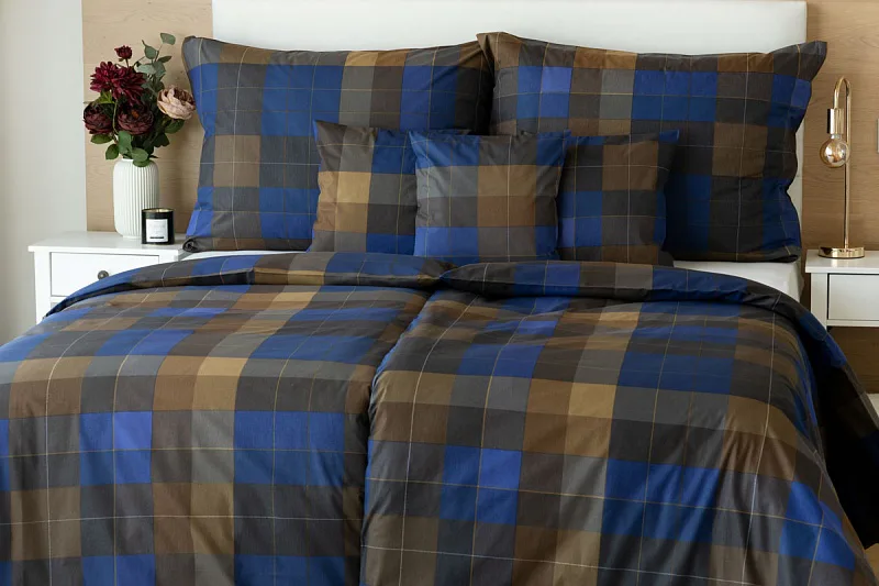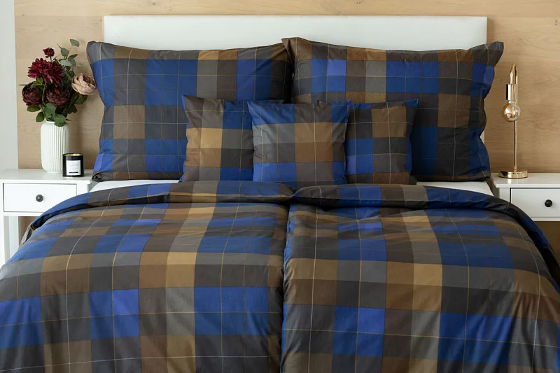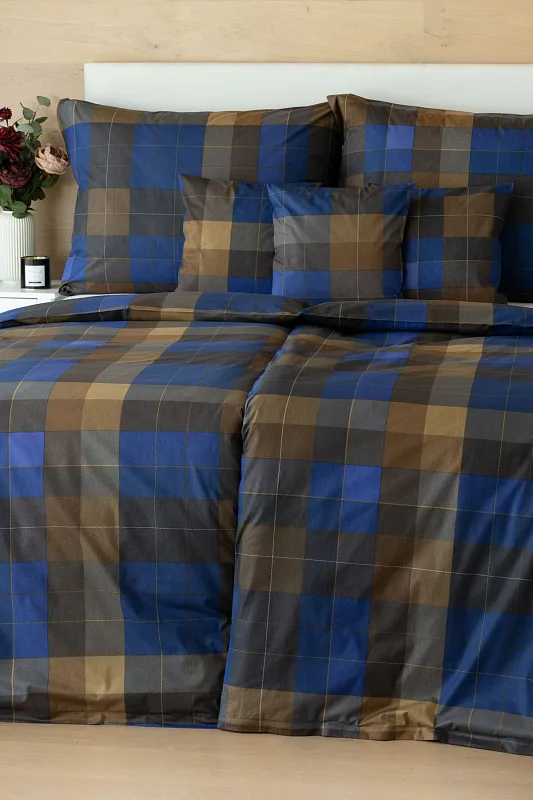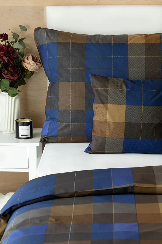 Bavlnené obliečky Shelby nesmú chýbať vo vašej výbave. Nadčasový kockovaný vzor v hrejivo hnedých a tmavomodrých tónoch vytvára pútavý celok, ktorý je nesmierne elegantný, praktický a vhodný do každej spálne.