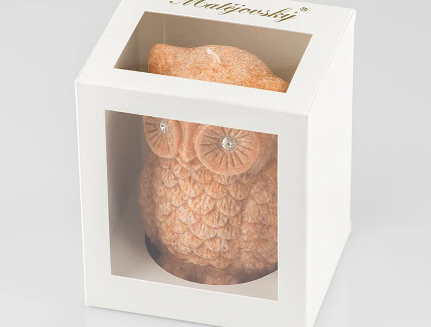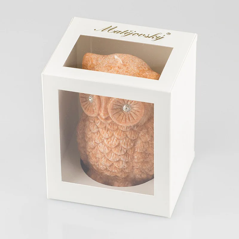 Ručně vyráběná svíčka ve tvaru sovičky v pastelovém odstínu skořicově hnědé barvy s jemnou mramorovanou texturou je skvělým tipem na originální dárek. Svíčka zdobená kamínky Swarovski je vyrobena z kvalitního palmového vosku a má jeden bavlněný knot. Trendy vzhled svíčky je doplněn sladkou ovocnou vůní. Dodáváme v elegantní dárkové krabičce.