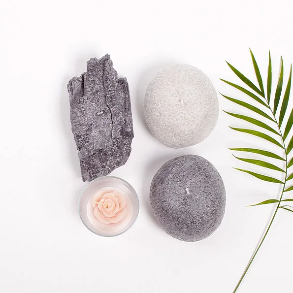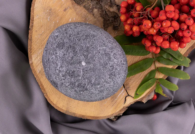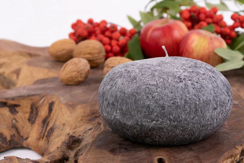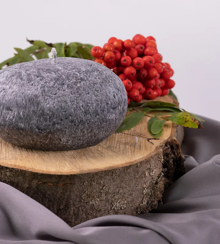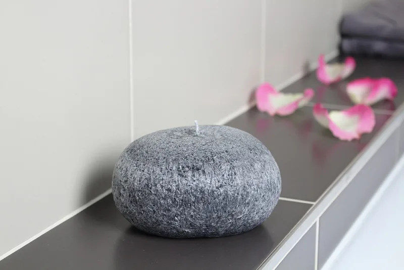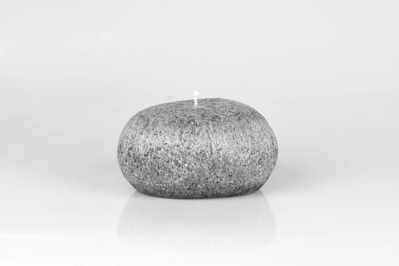 Ručně vyráběná svíčka ve tvaru oblého kamene tmavě šedé barvy s autentickou texturou je skvělým tipem na originální dárek.