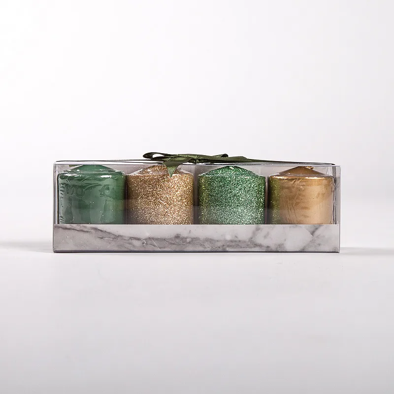 Nechte se inspirovat dárkovým balením čtyř elegantních svíček v kombinaci zářivých svátečních odstínů zelené a zlaté barvy.