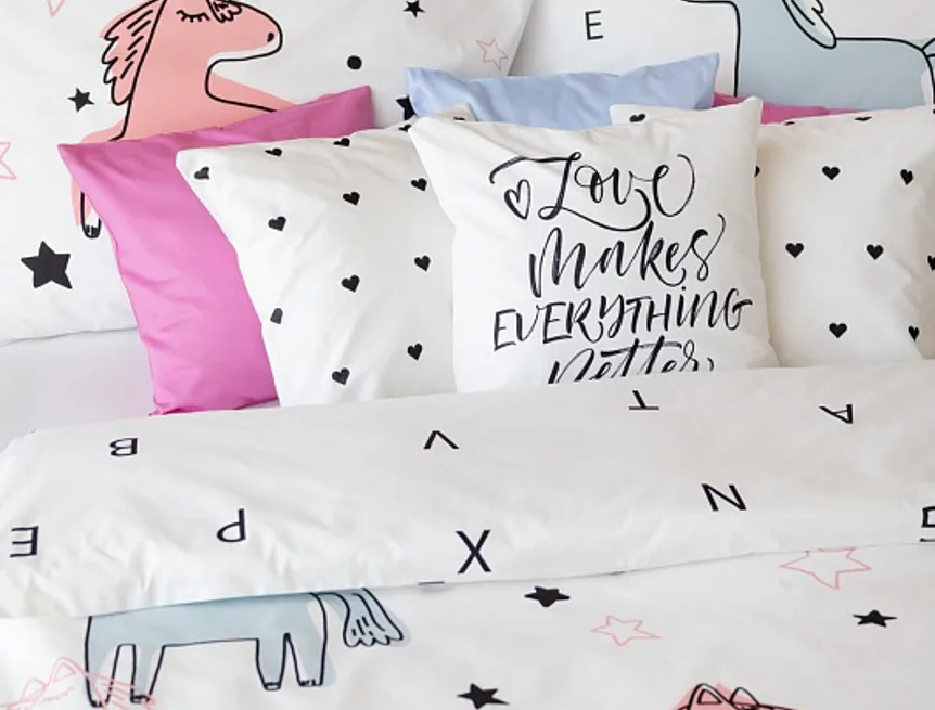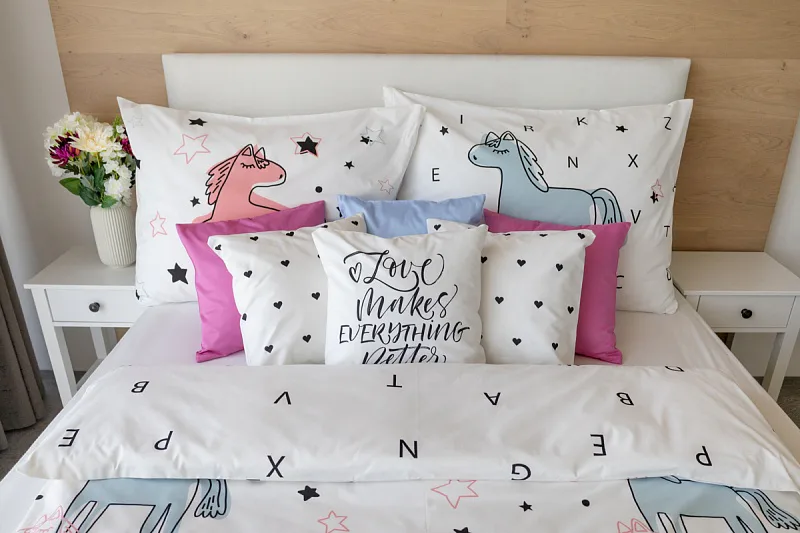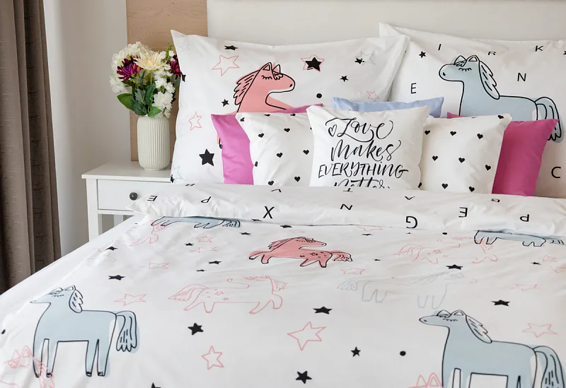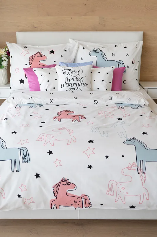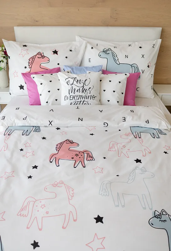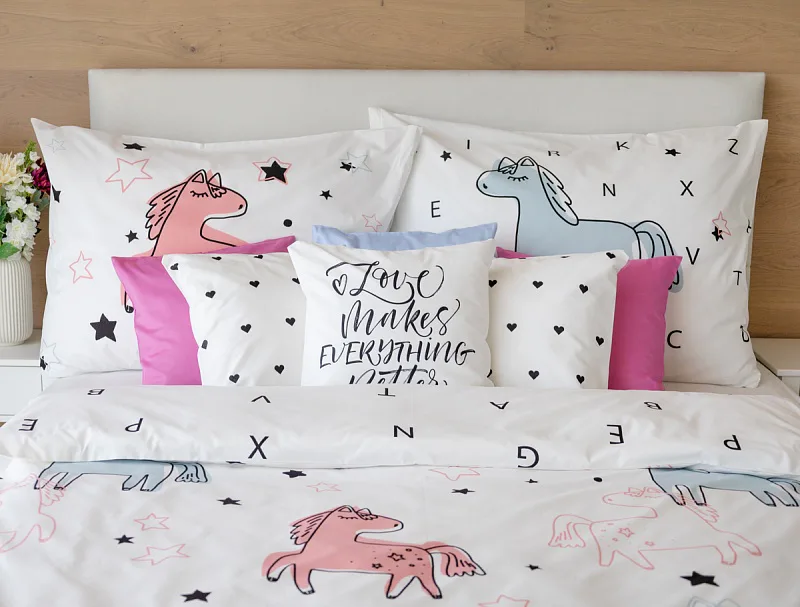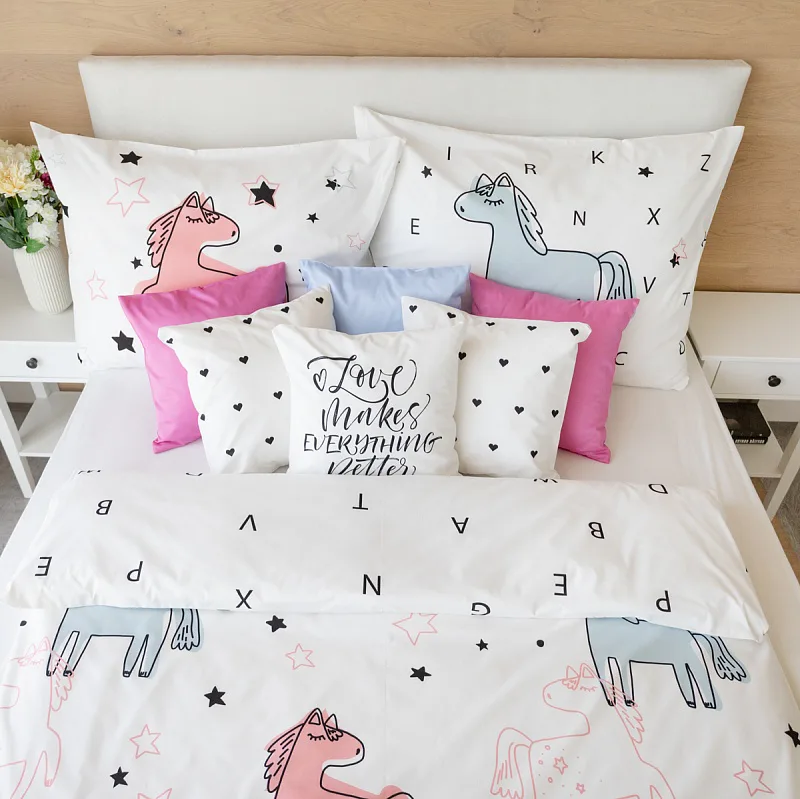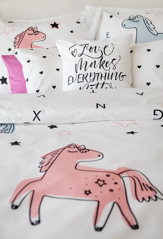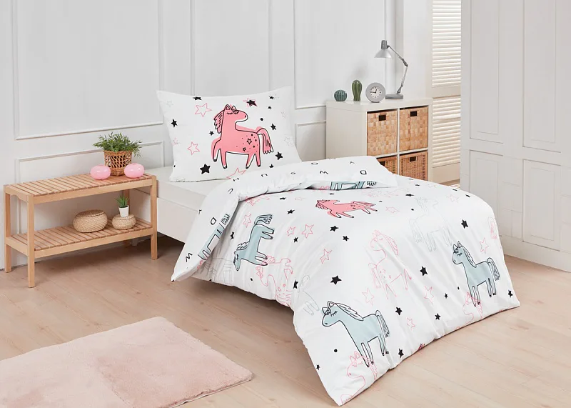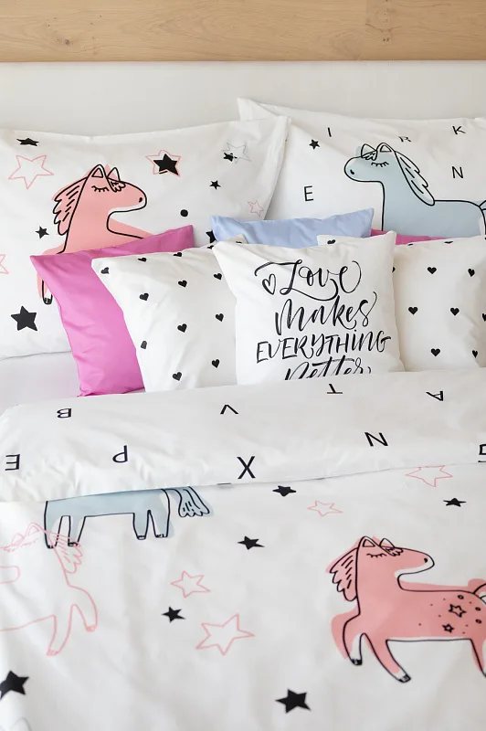 Detské bavlnené obliečky Sweet Pony podnietia svojou jednoduchosťou detskú fantáziu. Ručne maľované poníky dopĺňajú na vrchnej strane prikrývky a vankúša farebné a čierne hviezdičky. Spodná strana prikrývky na vankúš zachytáva modrého poníka s písmenkami, rovnako tak spodná strana prikrývky je po celej ploche posiata čiernymi písmenkami, ako je čiastočne vyobrazené na ilustračnej fotografii.