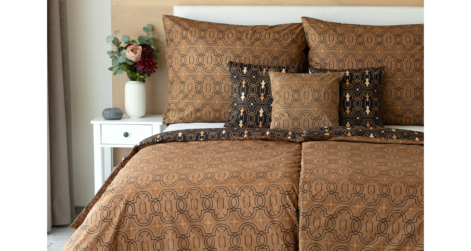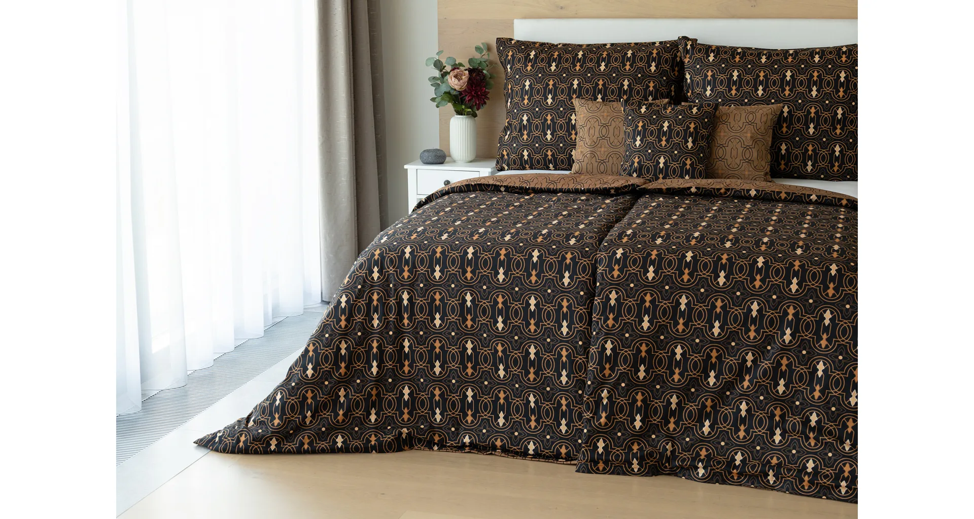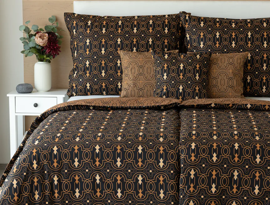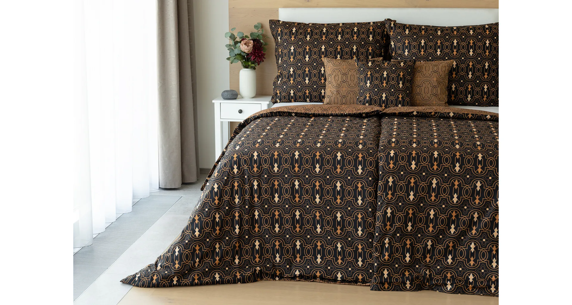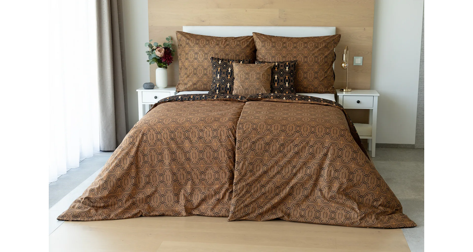 Obliečky Thalaso sú stvorené pre milovníkov luxusu a elegancie. Nechajte sa rozmaznávať hrejivými odtieňmi nugátu v kombinácii s čiernou a originálnym art deco motívom.