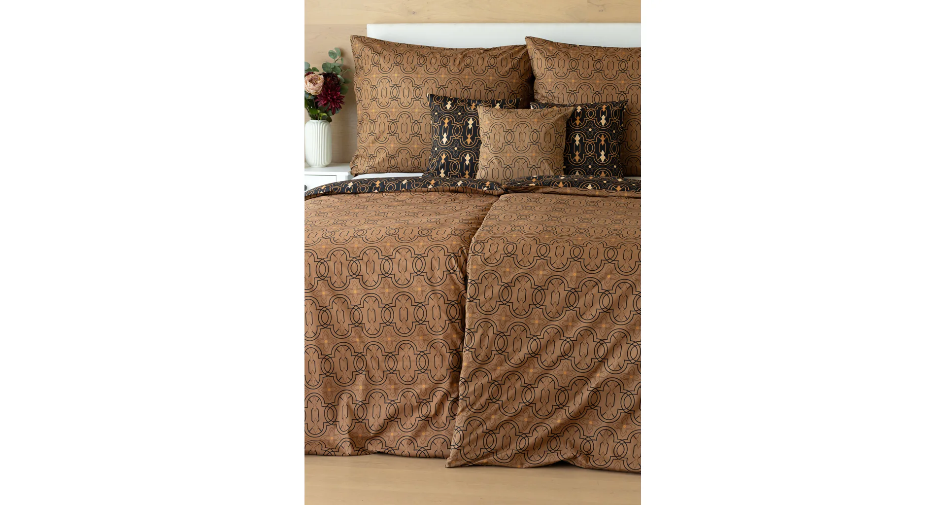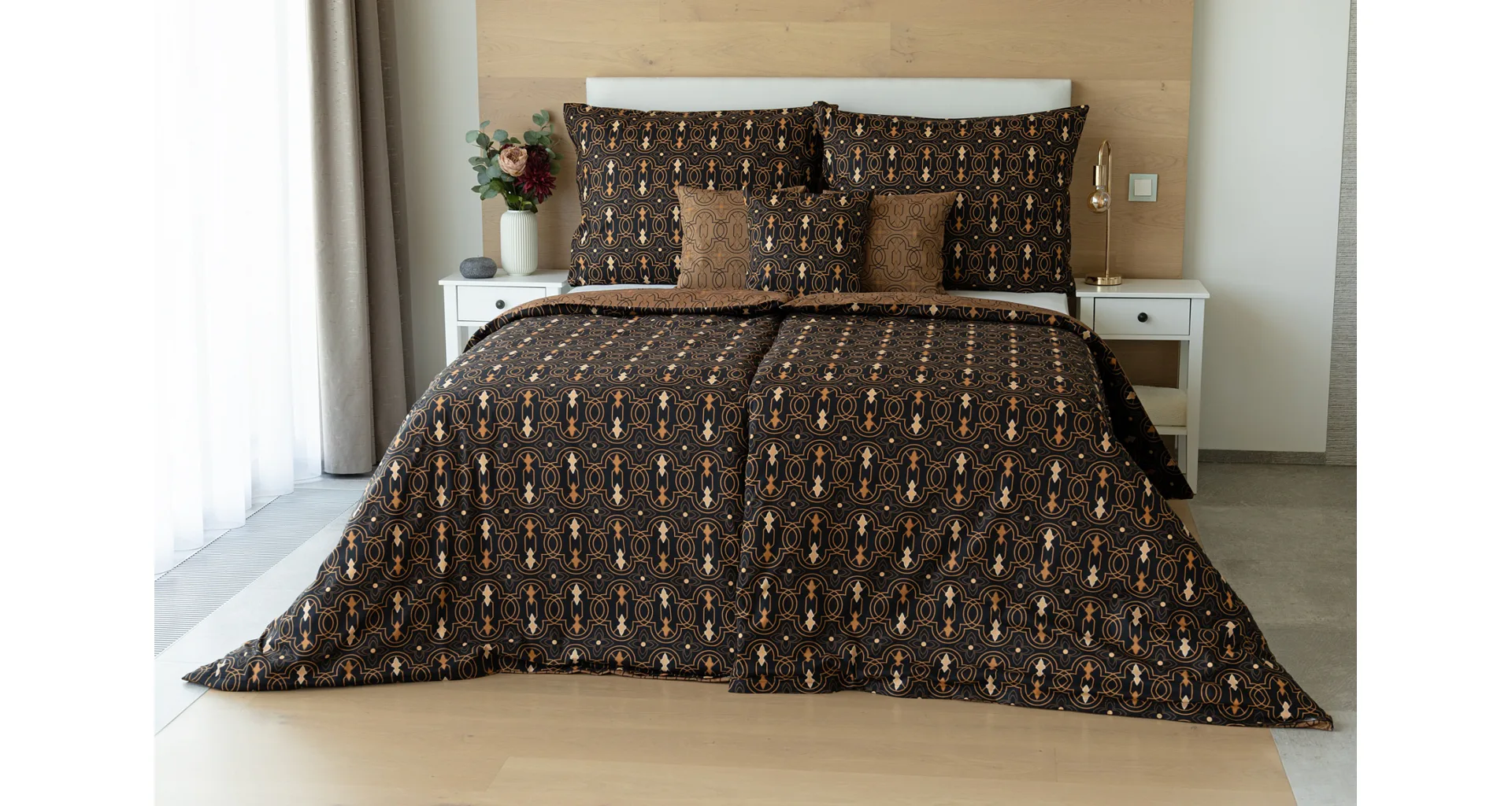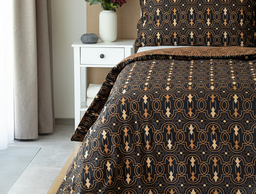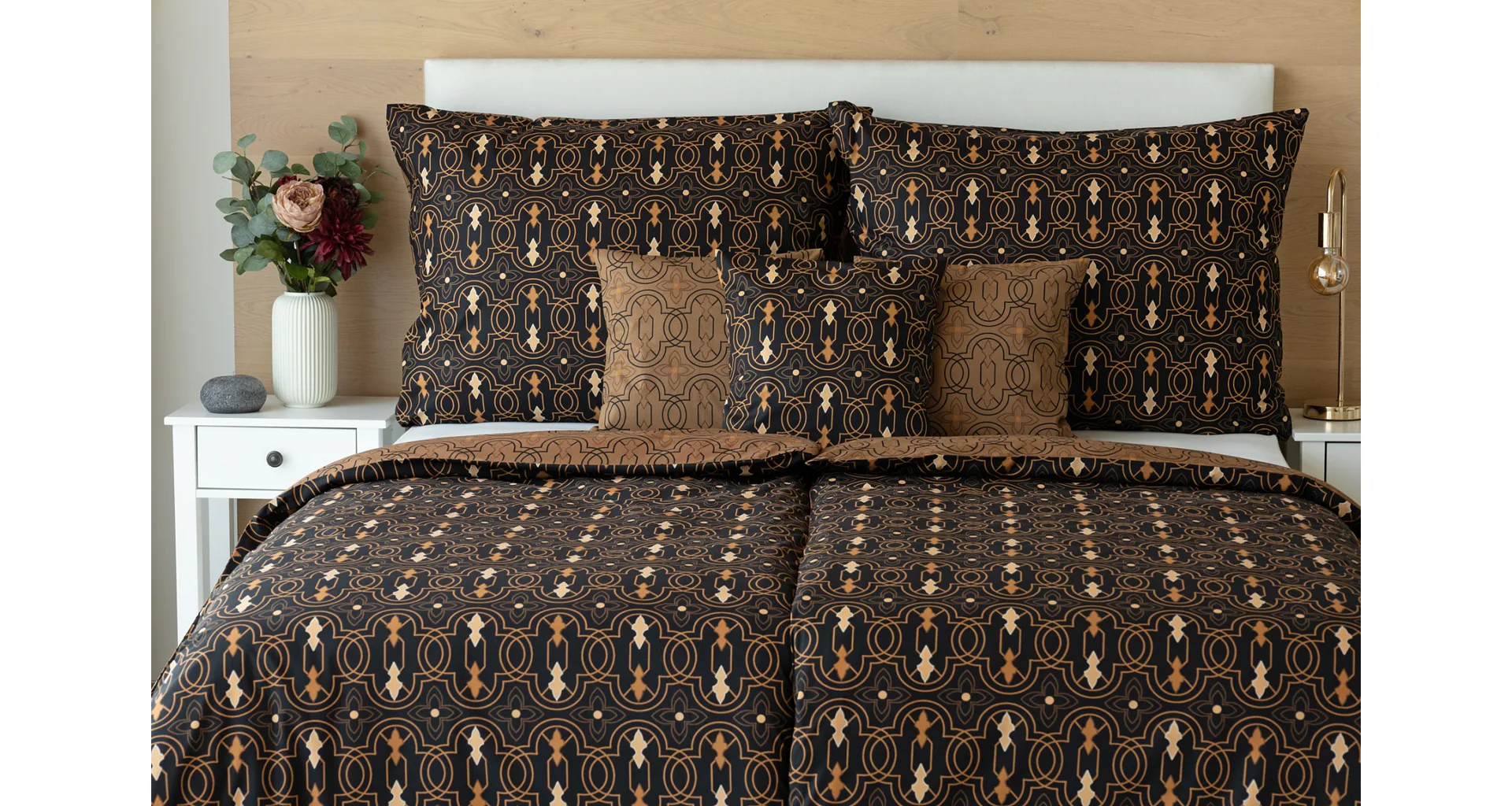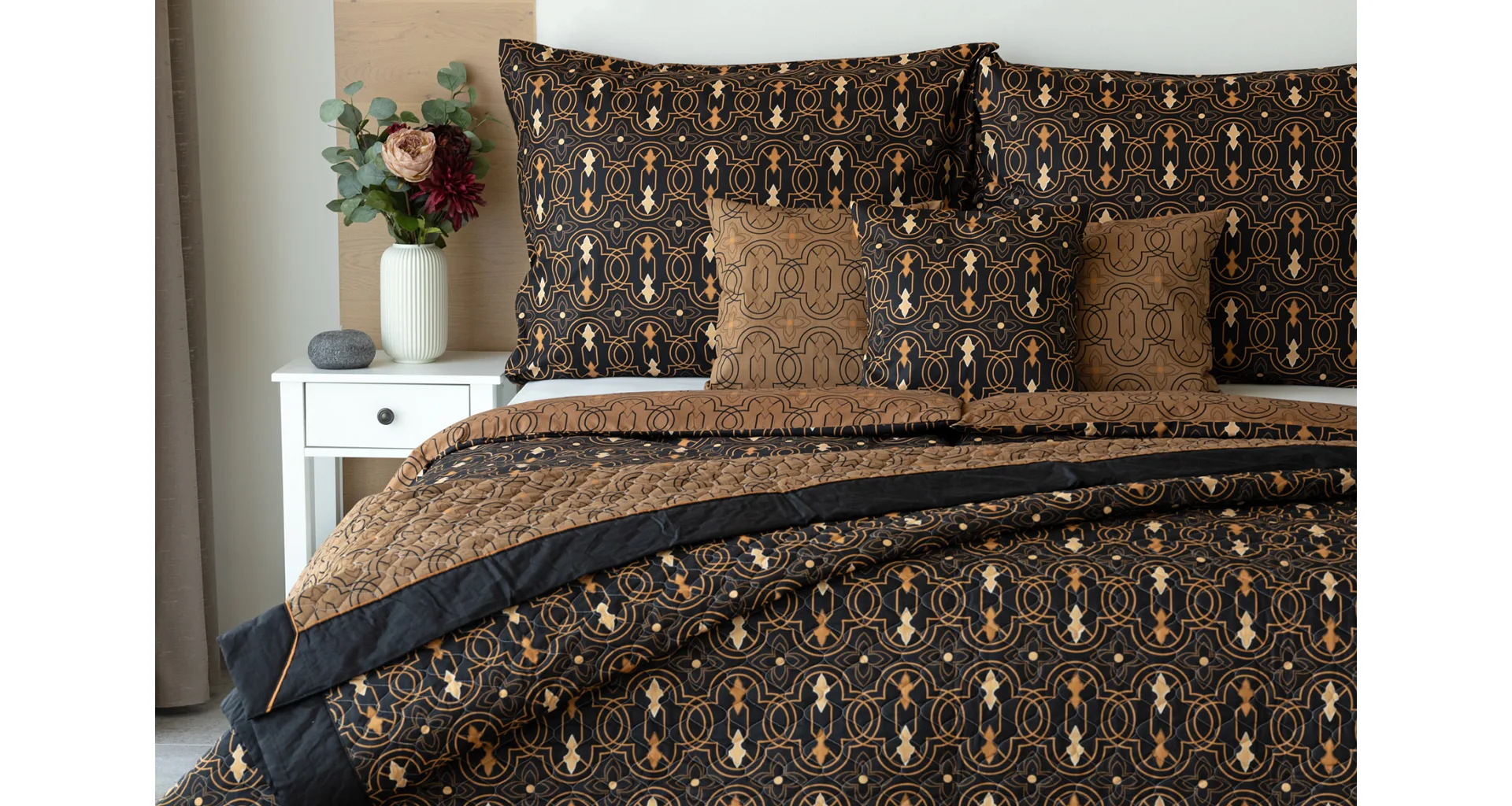 Obliečky Thalaso sú stvorené pre milovníkov luxusu a elegancie. Nechajte sa rozmaznávať hrejivými odtieňmi nugátu v kombinácii s čiernou a originálnym art deco motívom.
