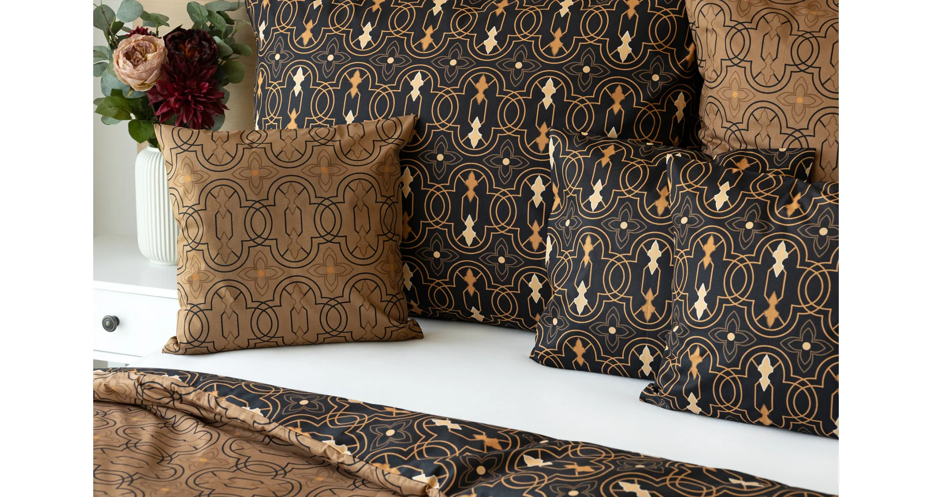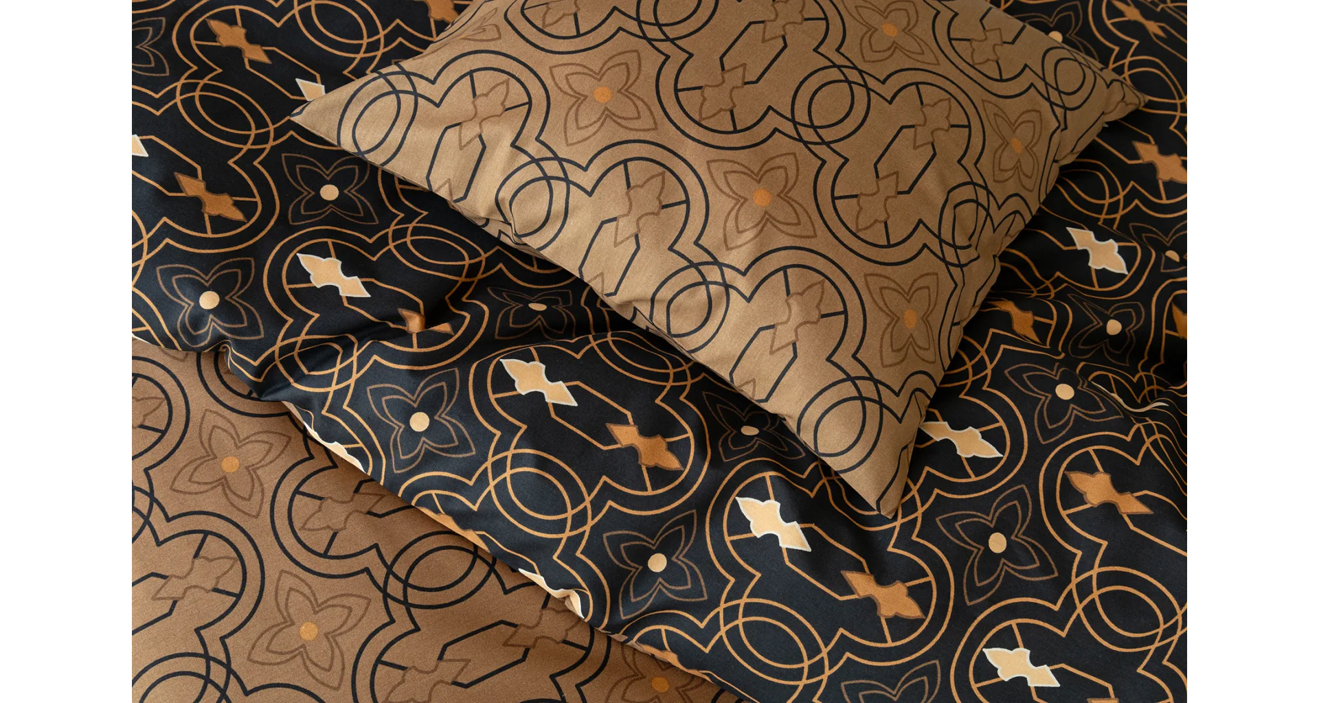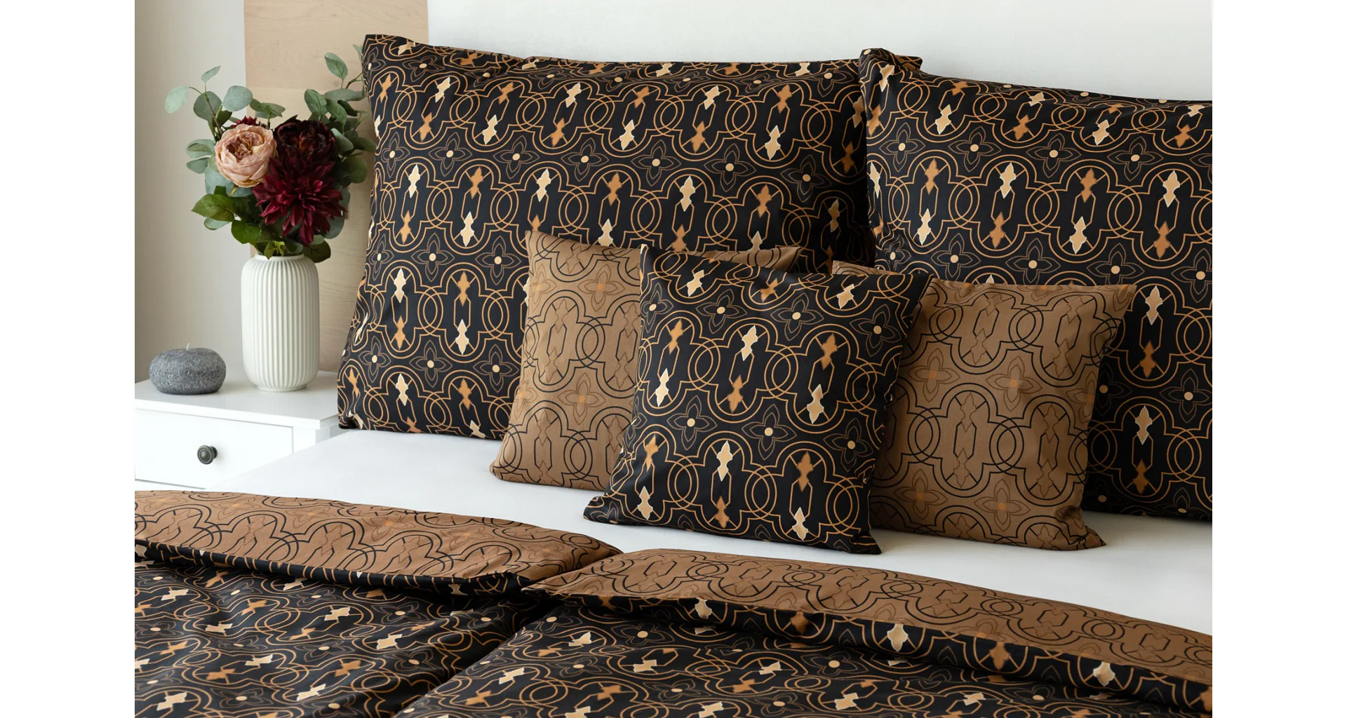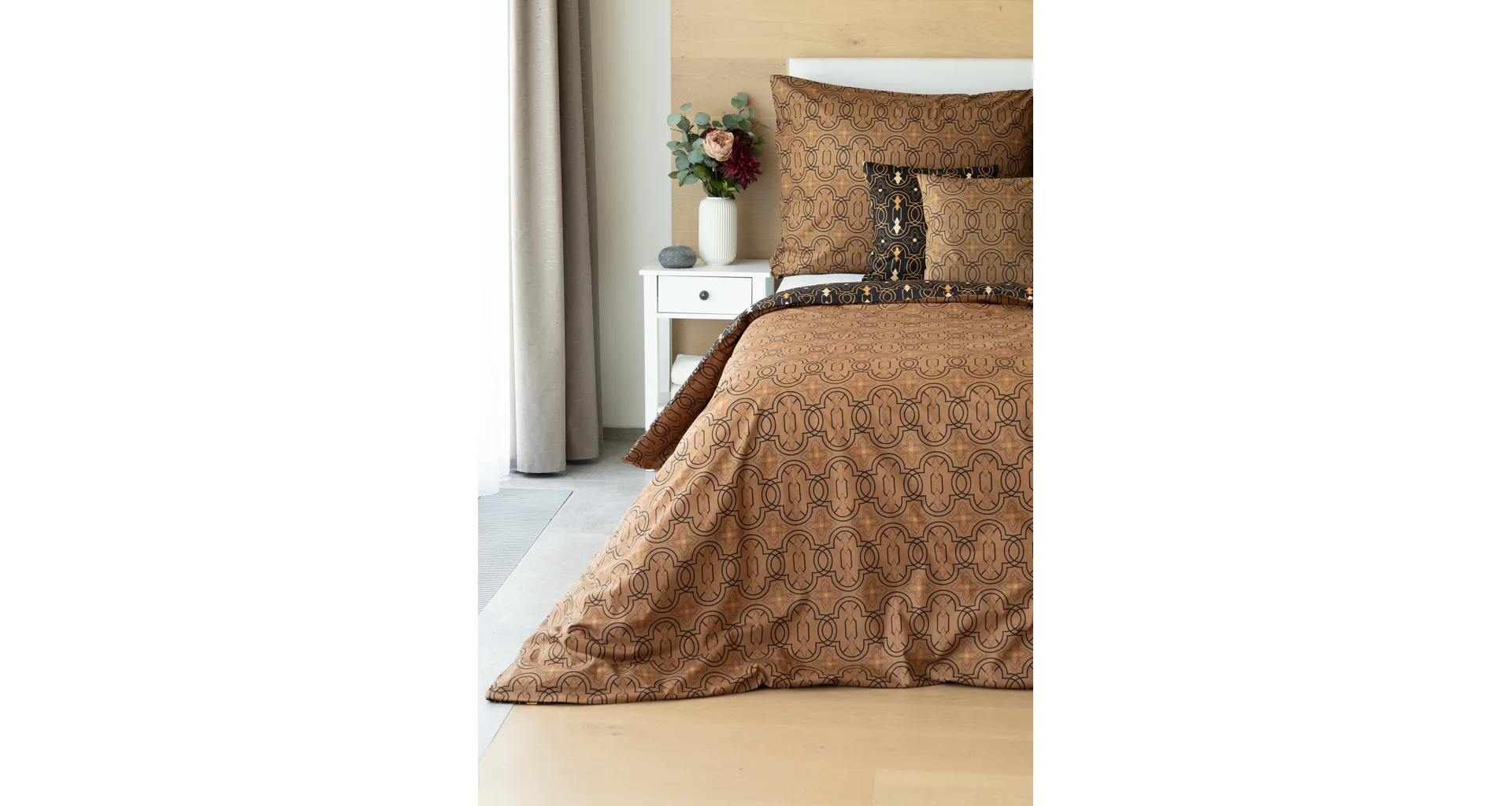 Obliečky Thalaso sú stvorené pre milovníkov luxusu a elegancie. Nechajte sa rozmaznávať hrejivými odtieňmi nugátu v kombinácii s čiernou a originálnym art deco motívom.