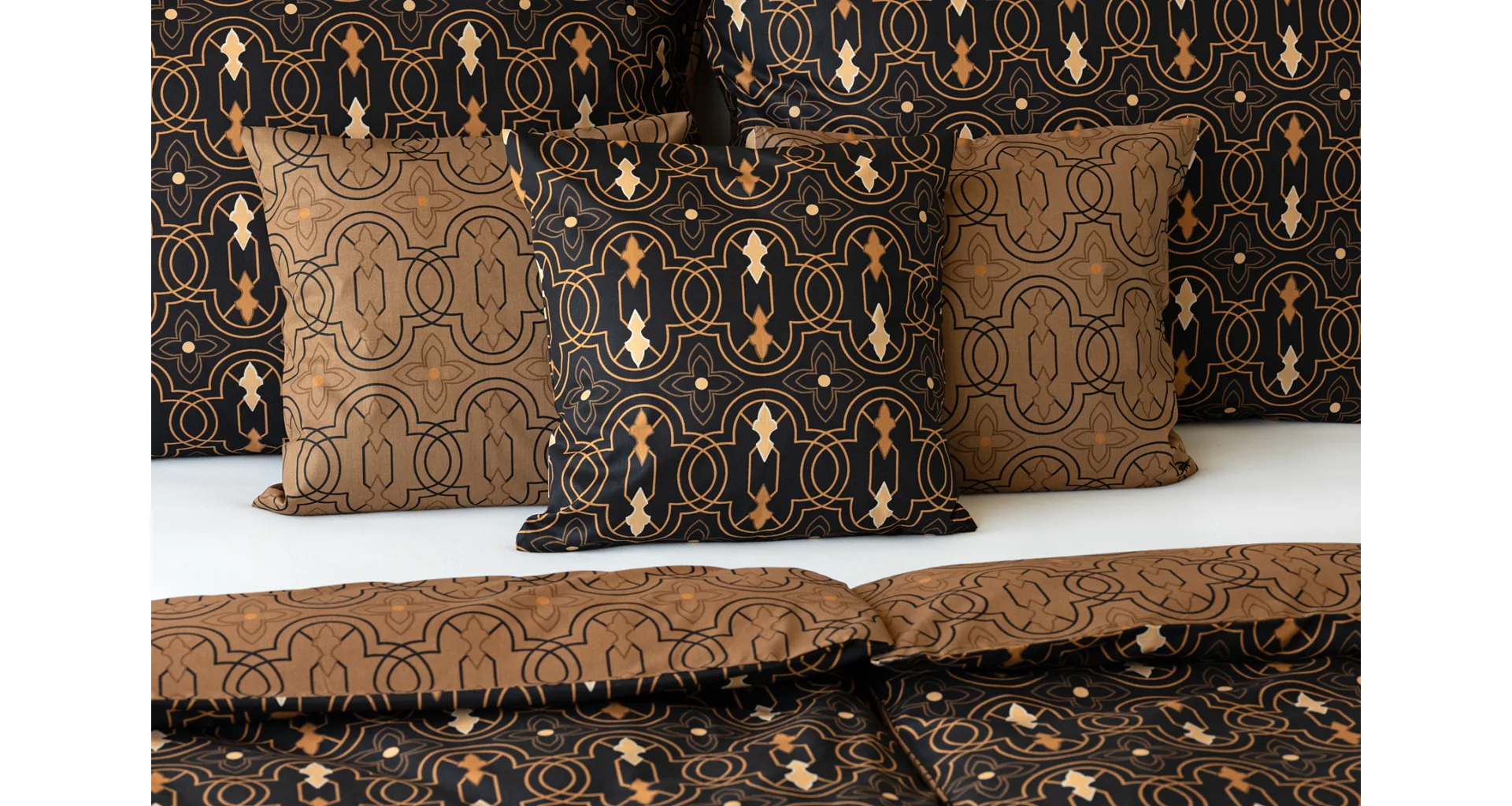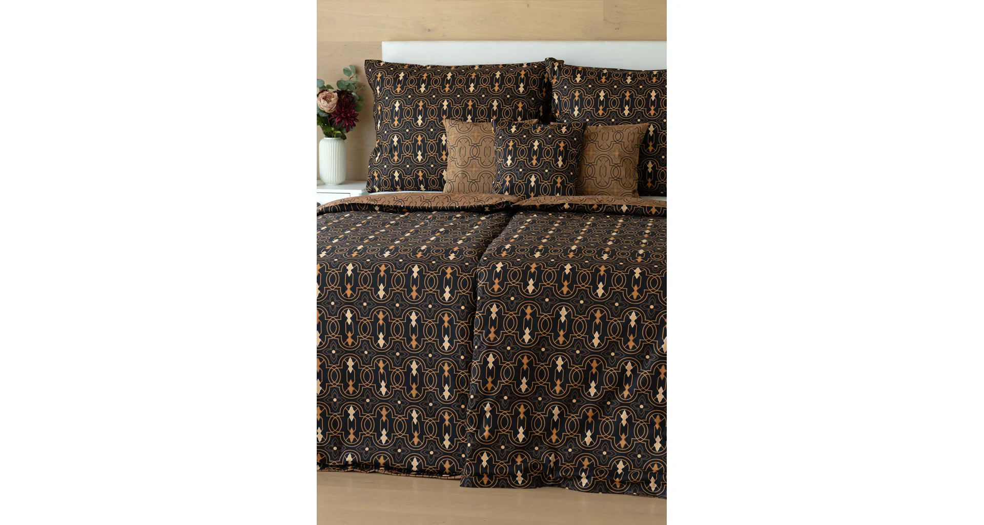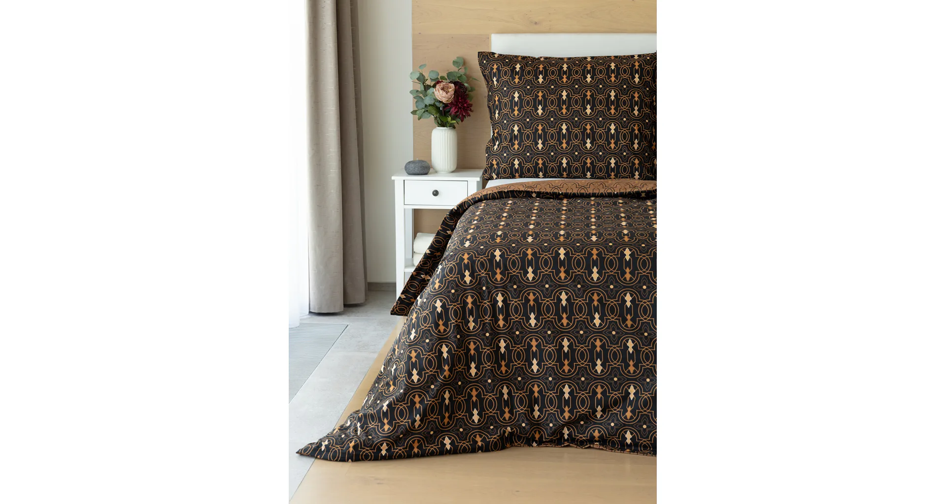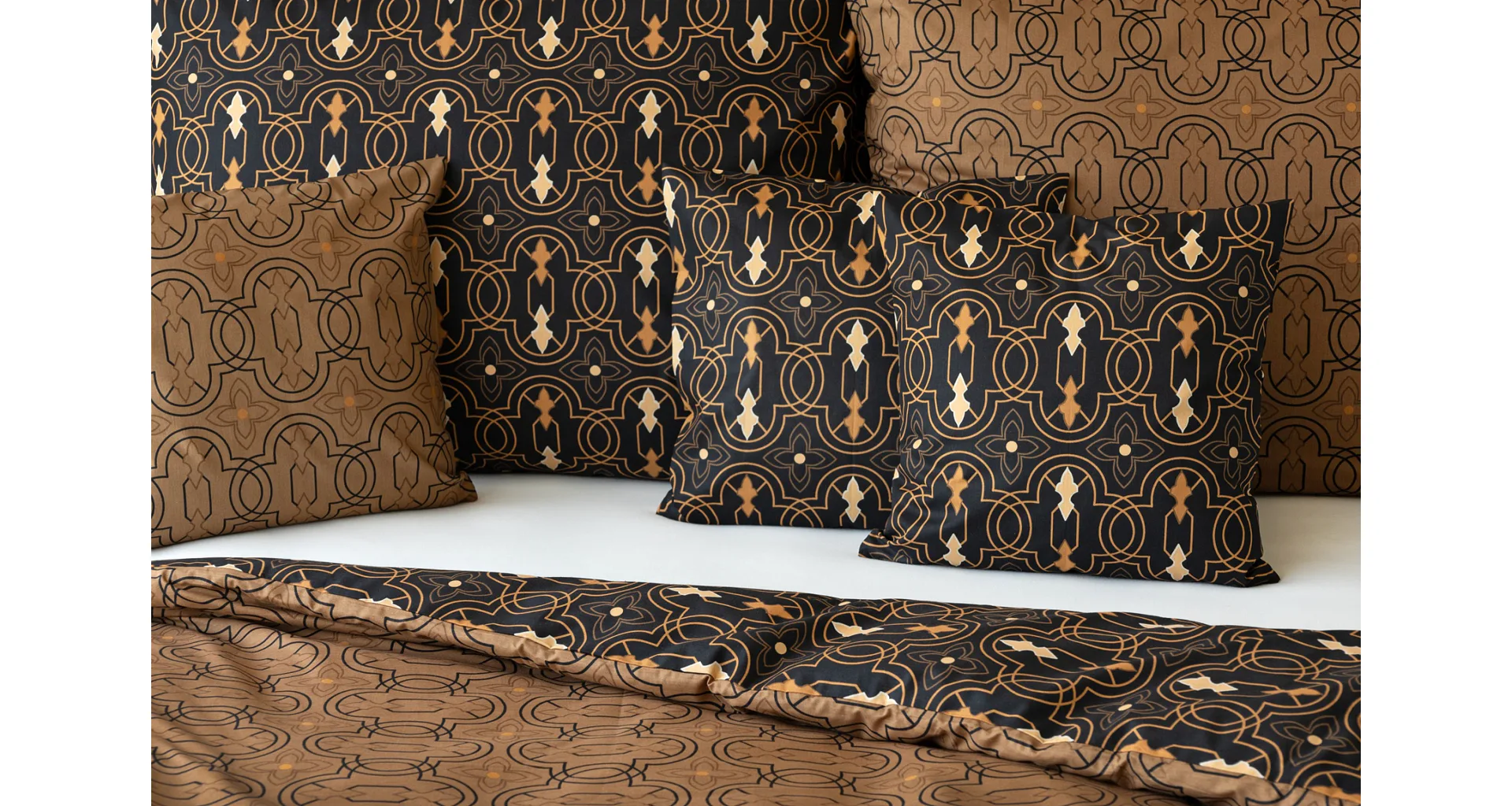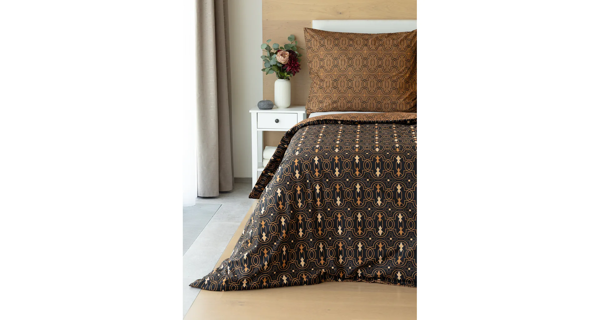Obliečky Thalaso sú stvorené pre milovníkov luxusu a elegancie. Nechajte sa rozmaznávať hrejivými odtieňmi nugátu v kombinácii s čiernou a originálnym art deco motívom.