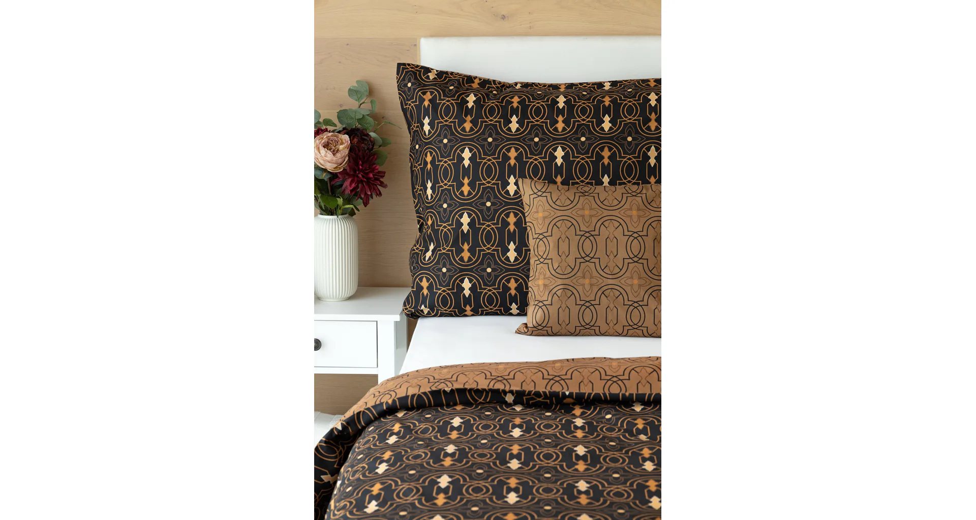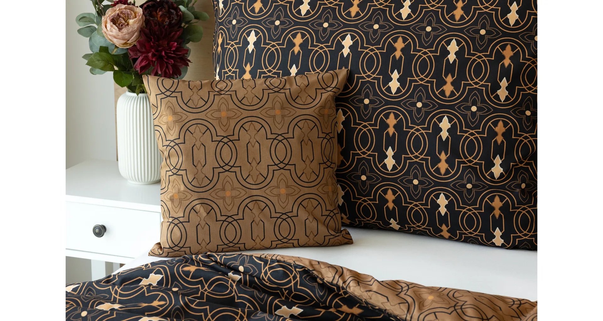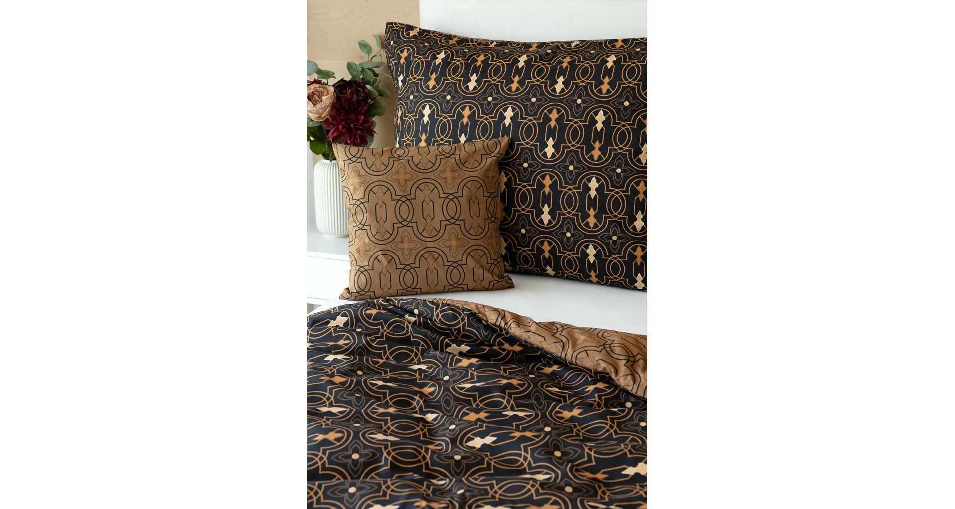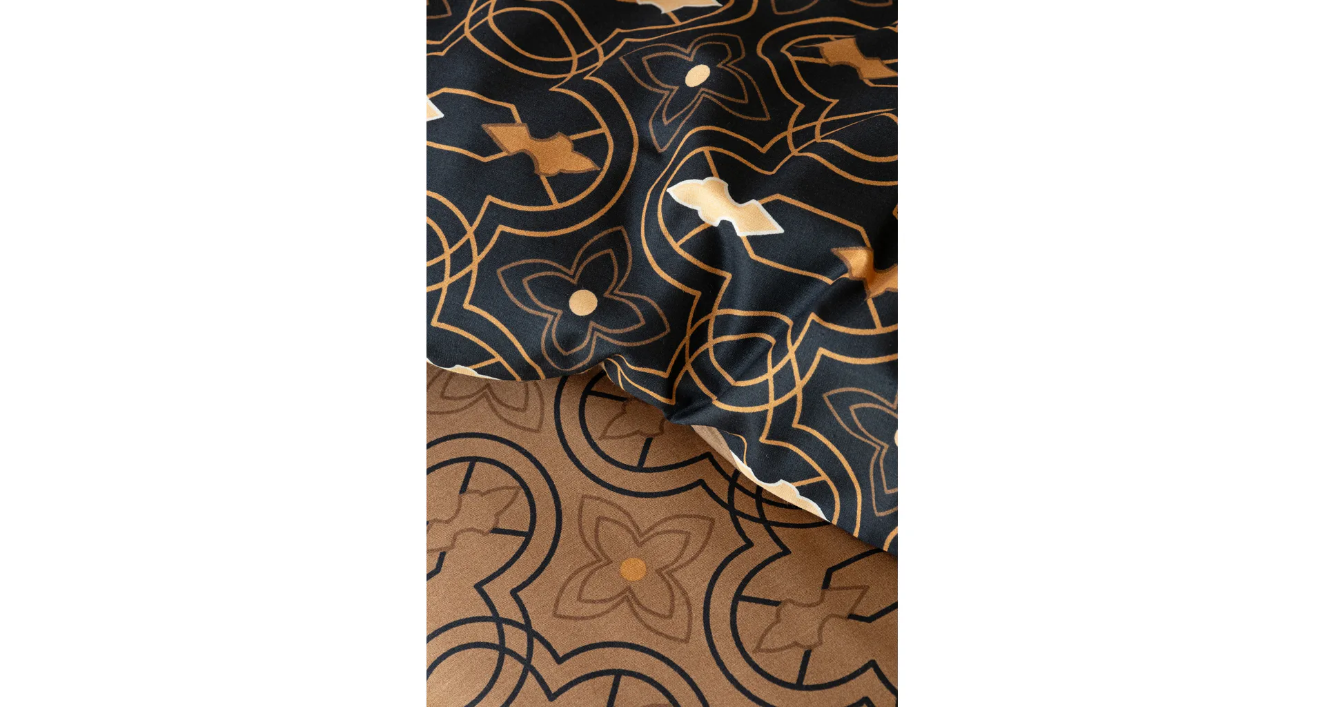 Obliečky Thalaso sú stvorené pre milovníkov luxusu a elegancie. Nechajte sa rozmaznávať hrejivými odtieňmi nugátu v kombinácii s čiernou a originálnym art deco motívom.