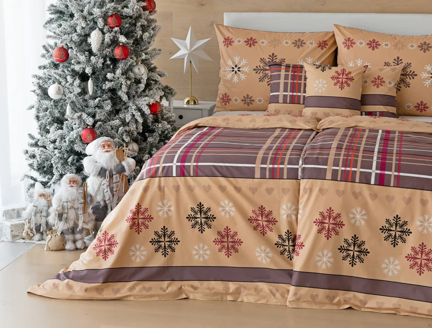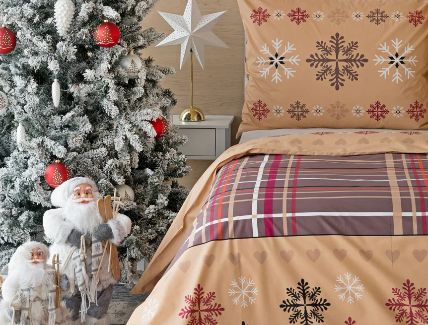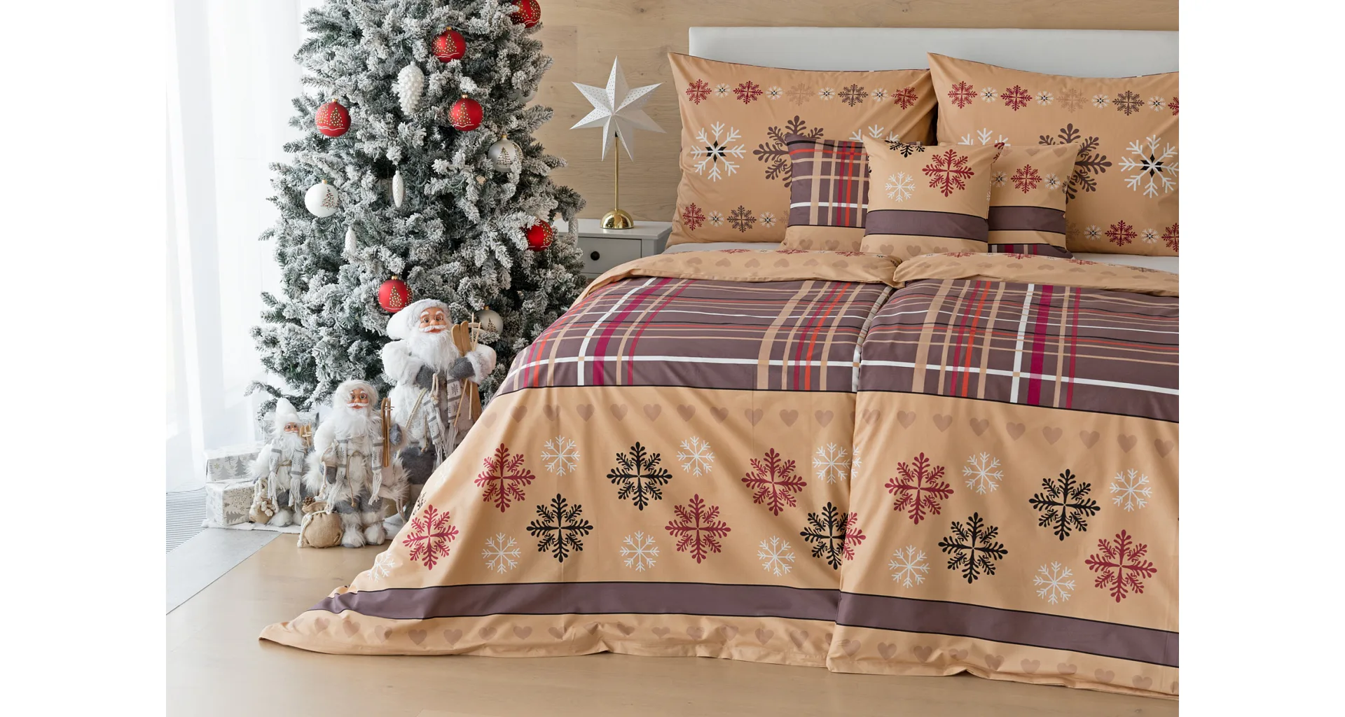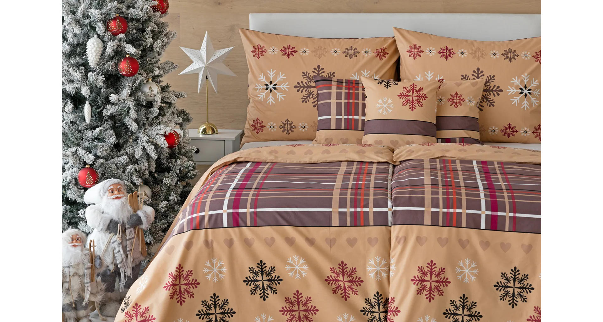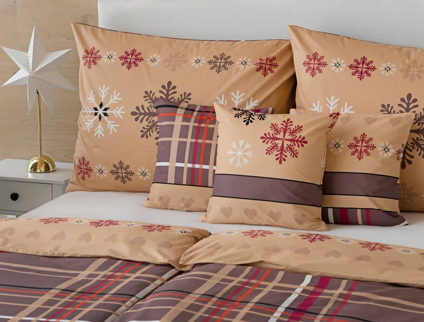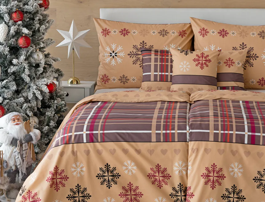 Atraktívny vianočný vzor v hrejivých tónoch lieskovoorieškovej a nugátovo hnedej prinášajú posteľné obliečky Tinsel. Vďaka nápaditému spojeniu motívov môžete pri stlaní každý deň experimentovať a vychutnávať si sviatočnú atmosféru. O váš pohodlný spánok sa postará luxusný flanel premium vyrobený zo 100% bavlny.