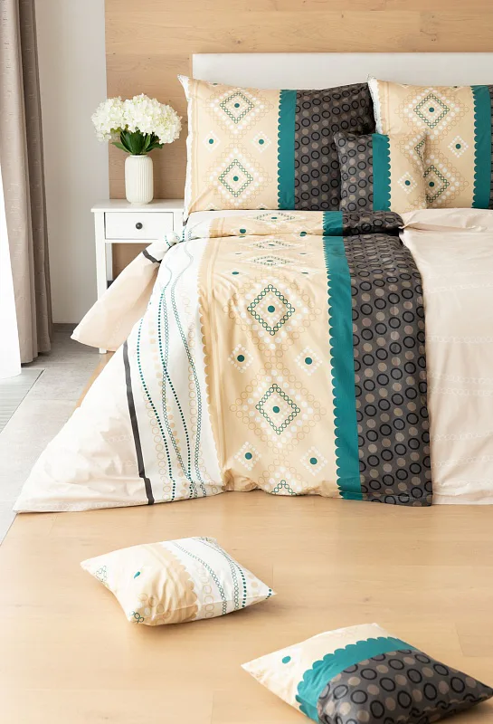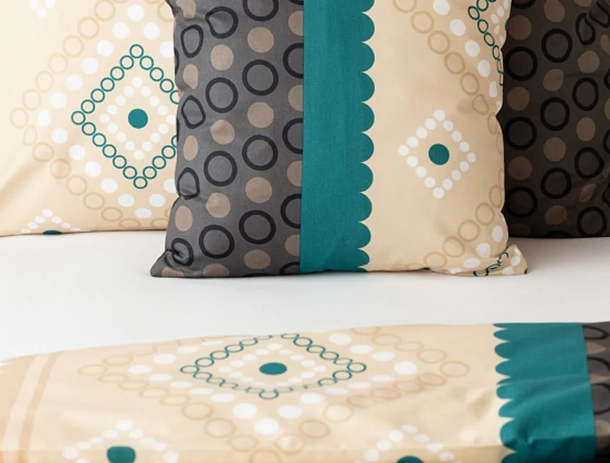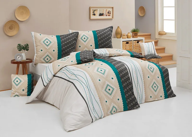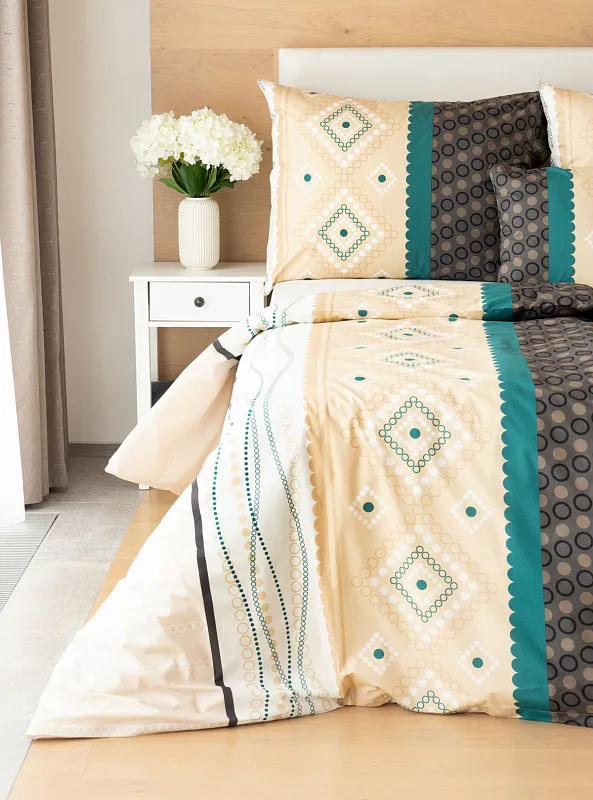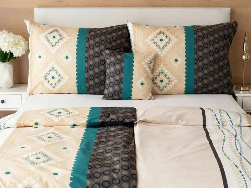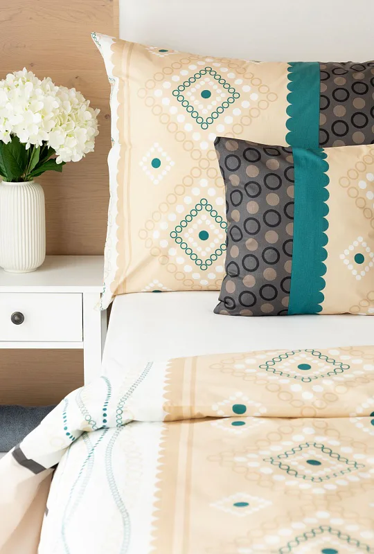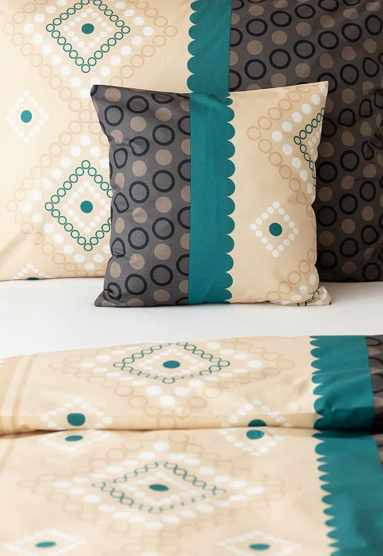 Atraktívna kombinácia farieb sa snúbi v jemnom geometrickom vzore posteľných obliečok Torin. Paletu krémových tónov dopĺňajú domyselne poskladané prvky v odtieňoch béžovej, petrolejovej a antracitovej.