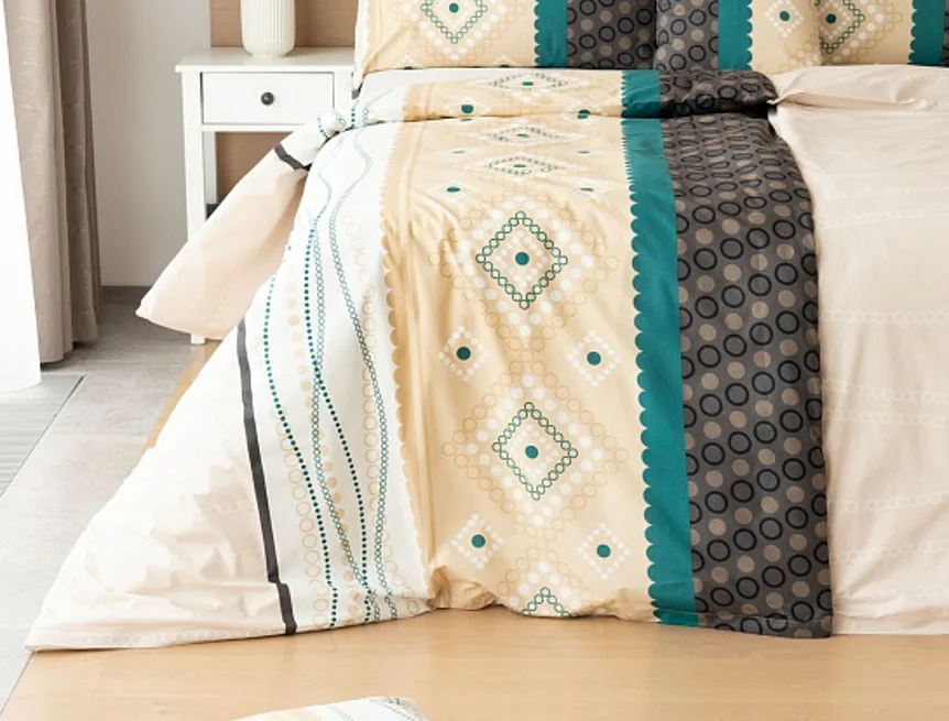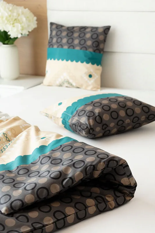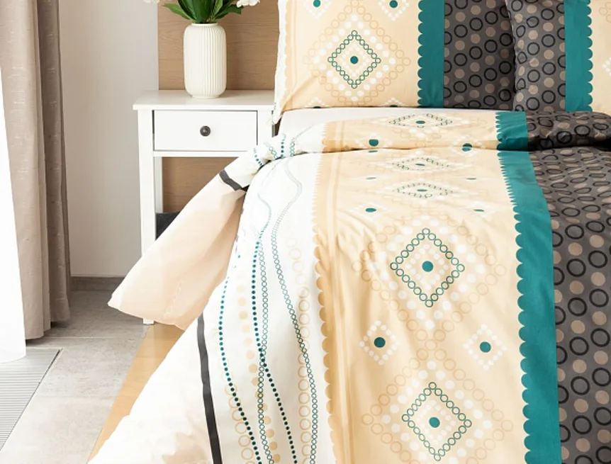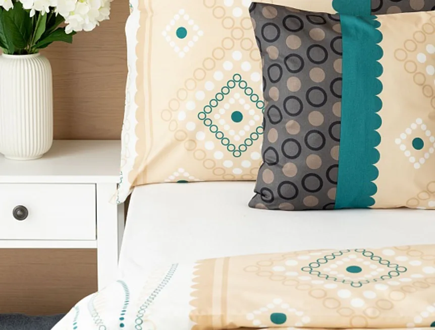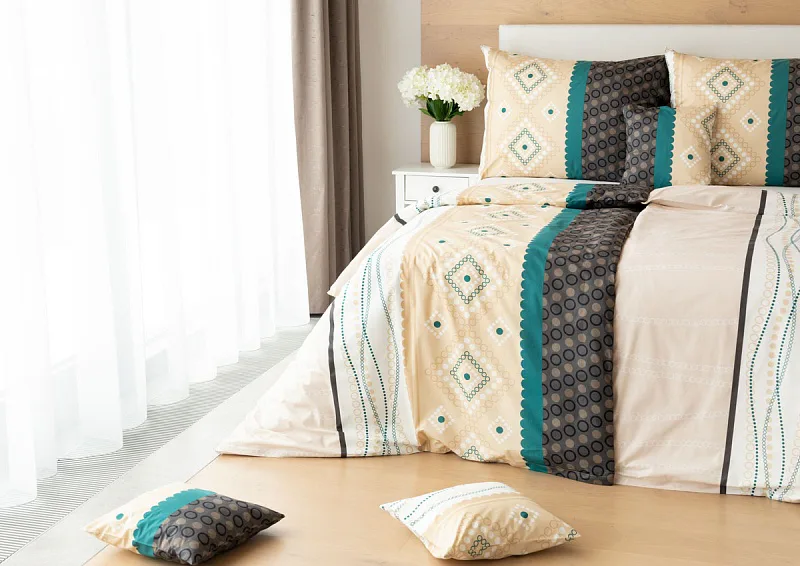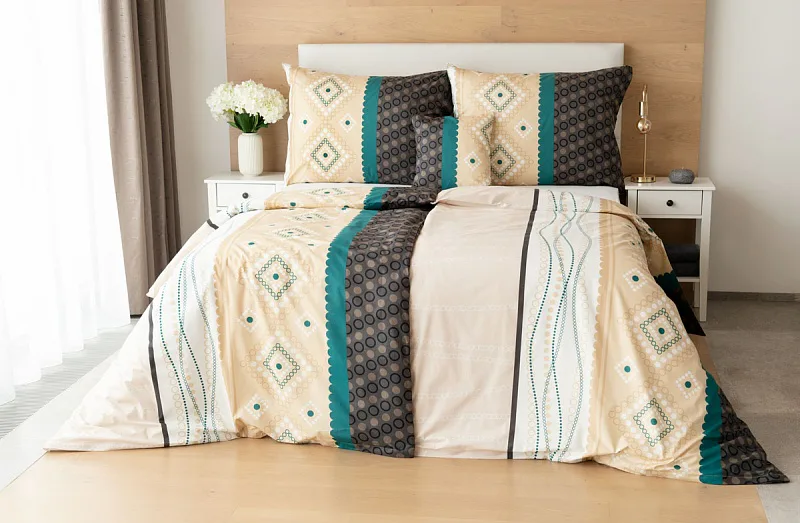 Atraktívna kombinácia farieb sa snúbi v jemnom geometrickom vzore posteľných obliečok Torin. Paletu krémových tónov dopĺňajú domyselne poskladané prvky v odtieňoch béžovej, petrolejovej a antracitovej.