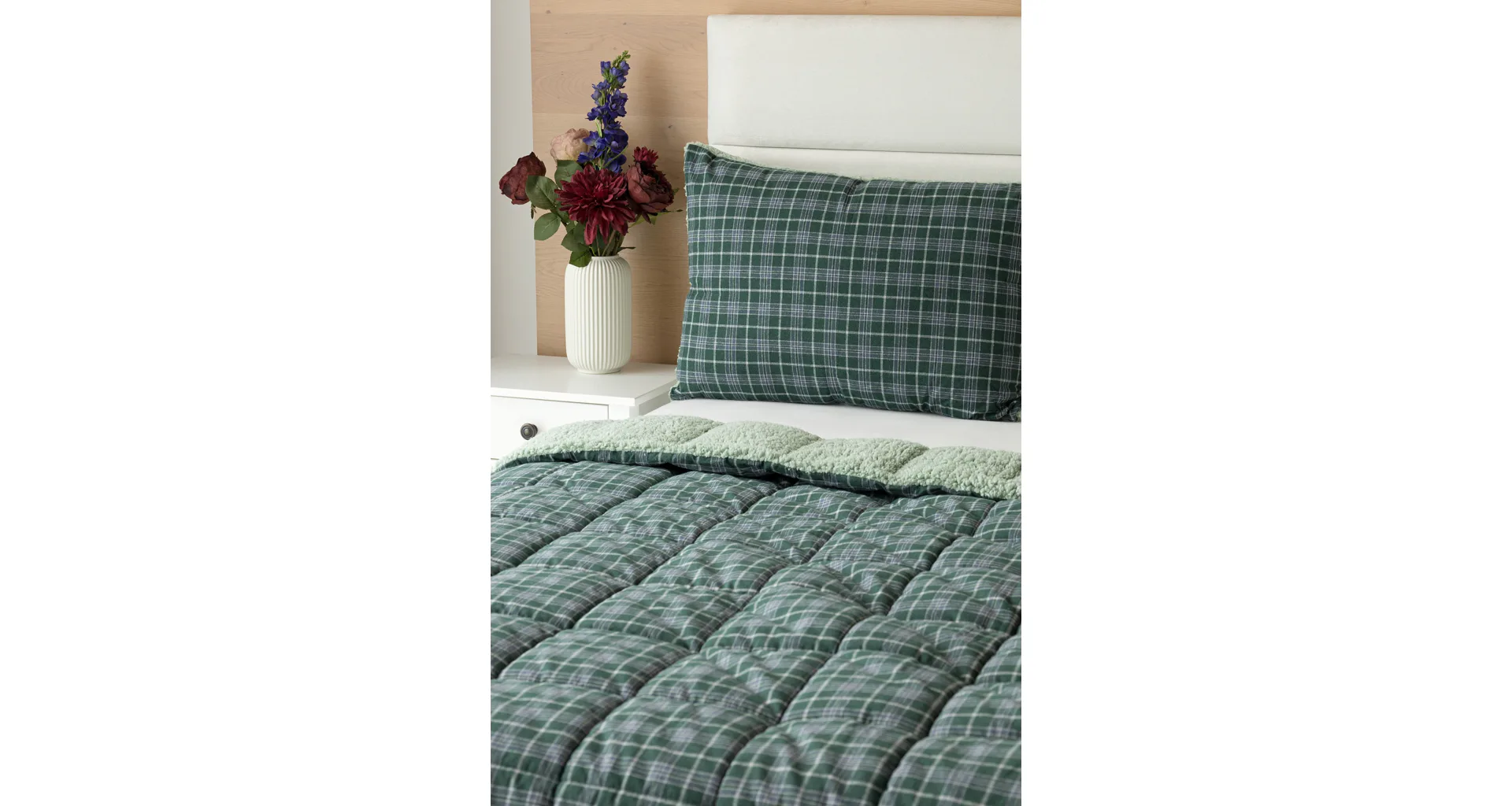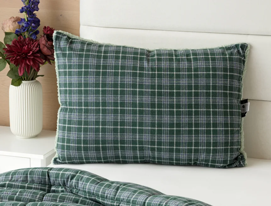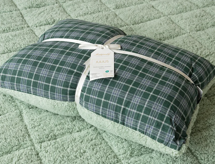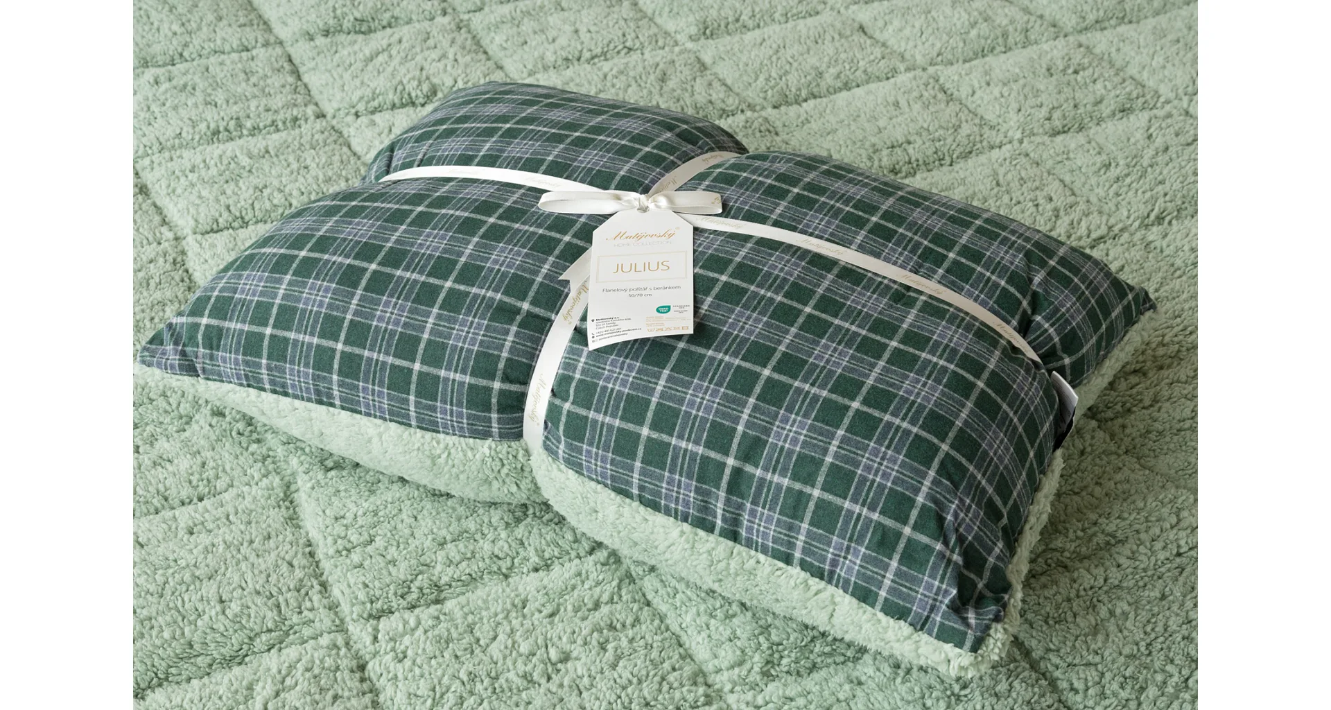 Atraktívny kockovaný vzor Julius v palete sviatočných zelených a tlmených šedomodrých tónov dopĺňa baránok svetlo zelenej farby. K vankúšu možno dokúpiť prikrývku v rovnakom designe.