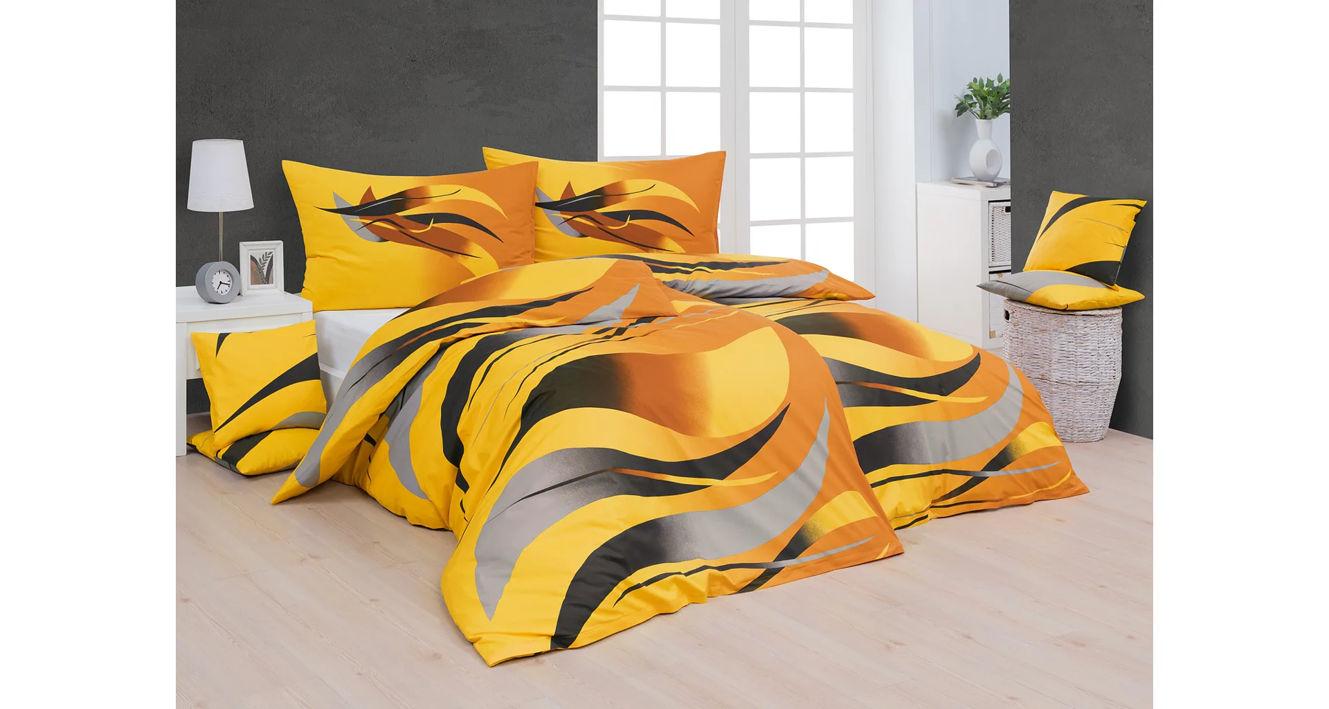 Výrazná a extravagantná posteľná bielizeň VENUS s pútavým vzorom bude štýlovým doplnkom vašej spálne. Žiarivo žltá farba v kombinácii s čiernym, sivým a hnedým vzorom je originálna a nabije vás pozitívnou energiou.