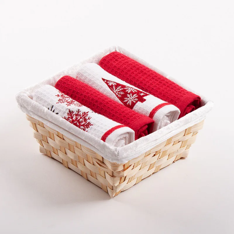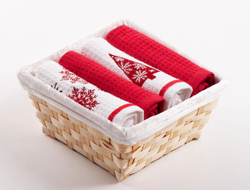 Prútený košík s textilnou výšivkou je súčasťou celého balenia, spoločne s utierkami je zabalený v celofáne a doplnený ozdobnou mašľou.