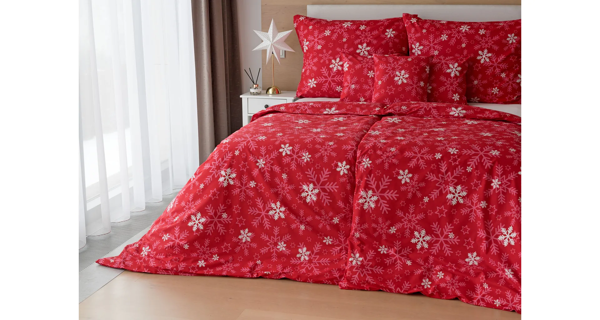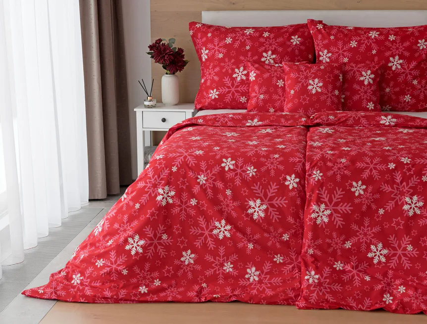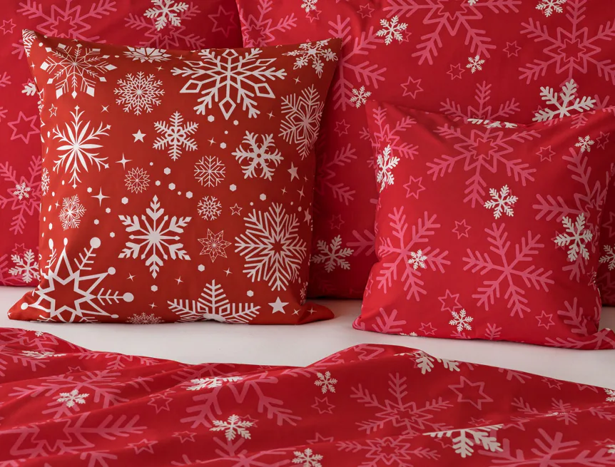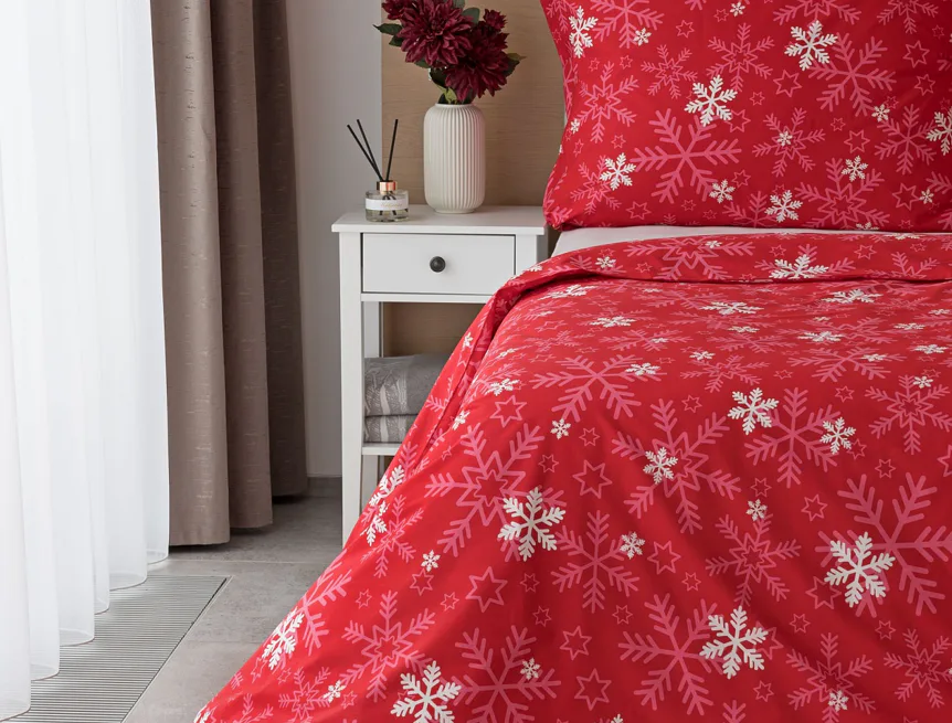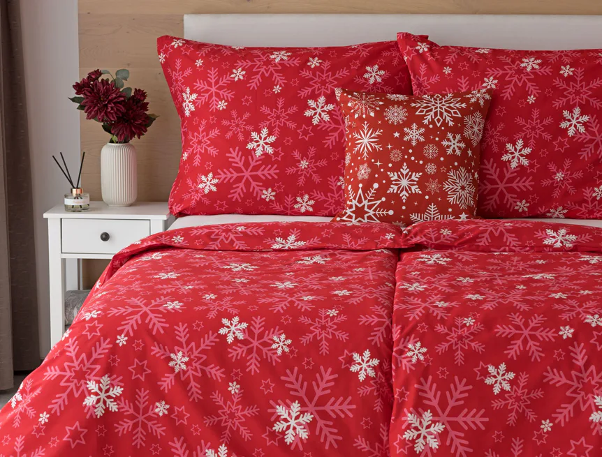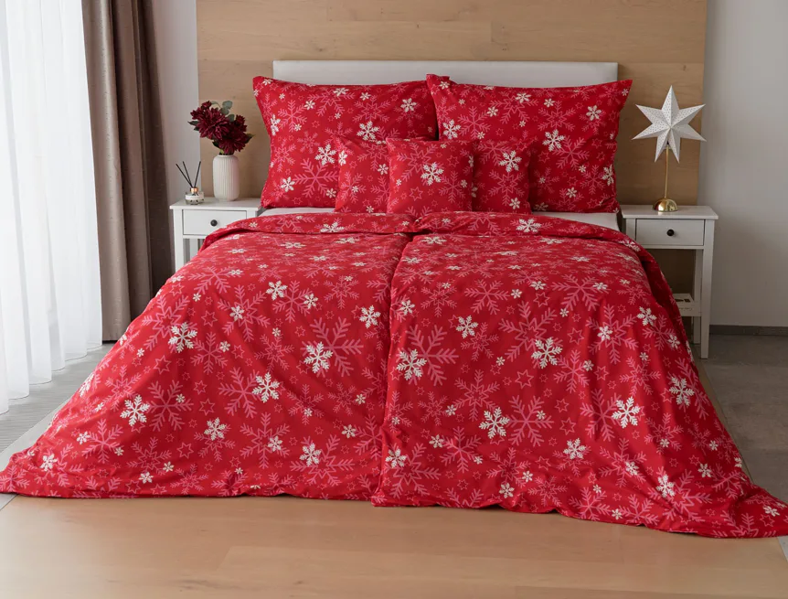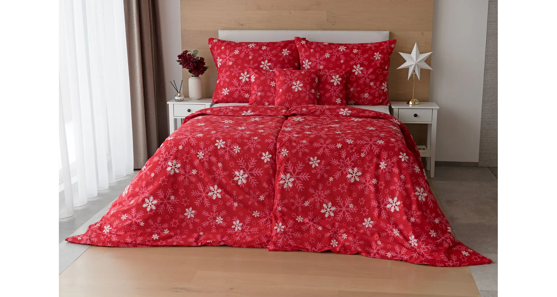 Sviatočne vyzerajúci vzor posiaty snehovými vločkami prináša posteľná bielizeň VLOČKY. Sýty vianočný odtieň červenej farby posiaty snehovými vločkami rozžiari každý interiér. Obliečka na prikrývku aj na vankúš je z oboch strán rovnaká.