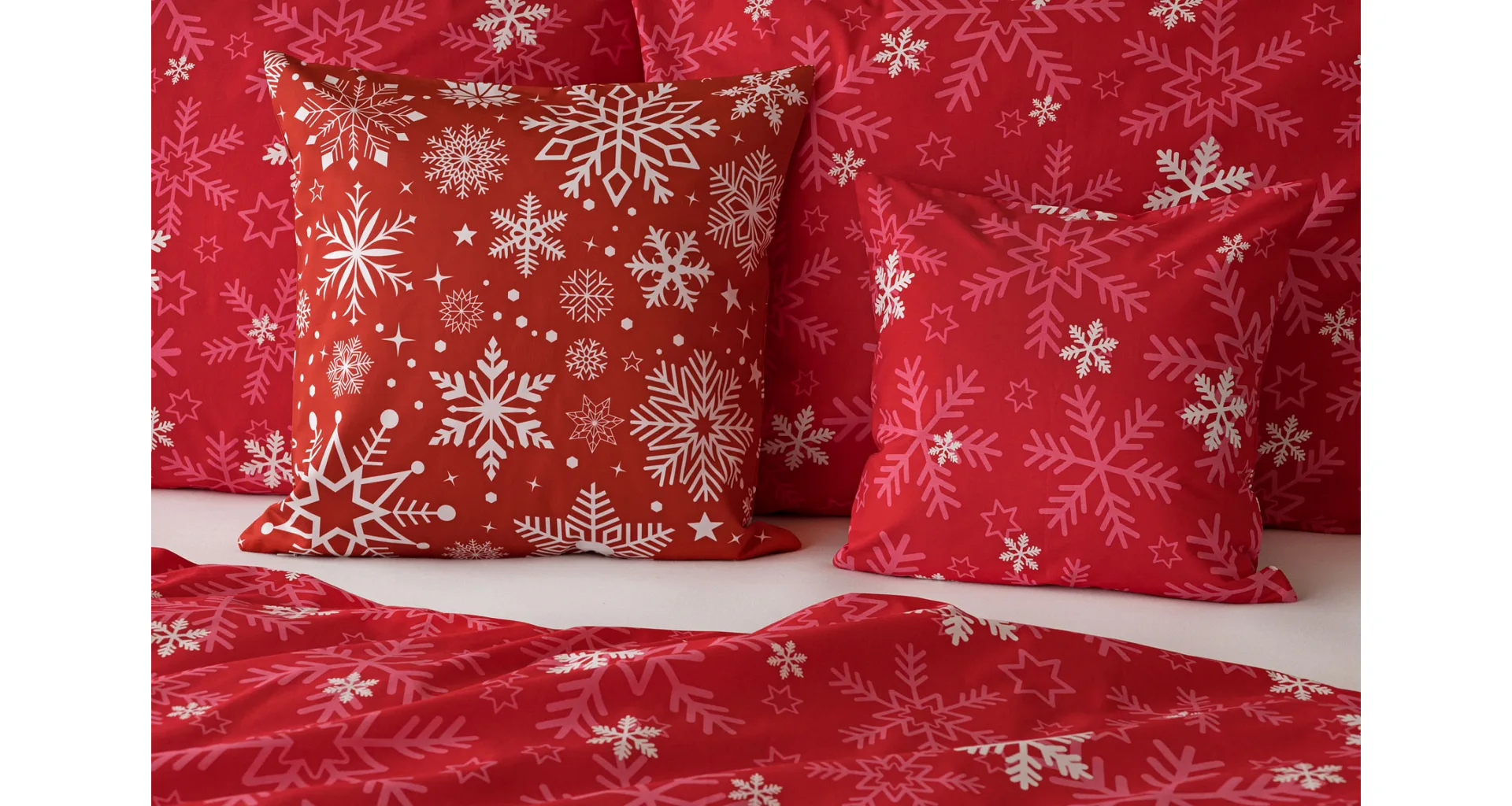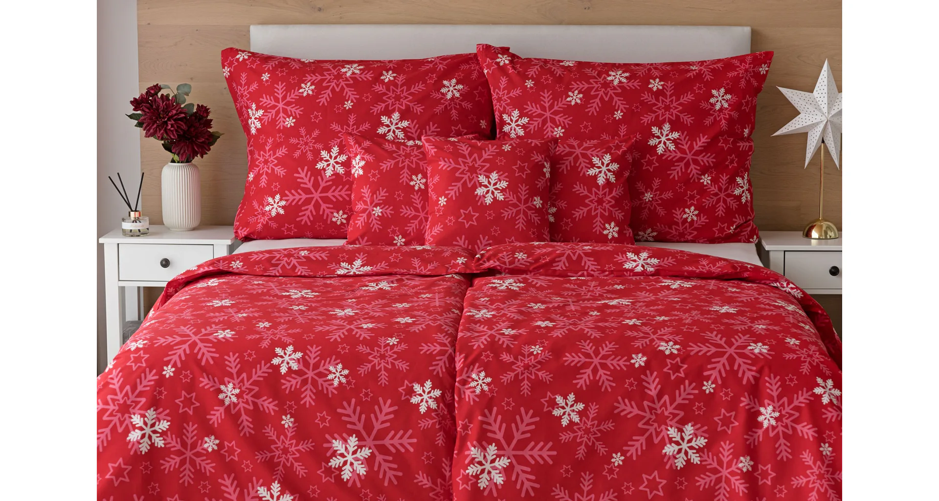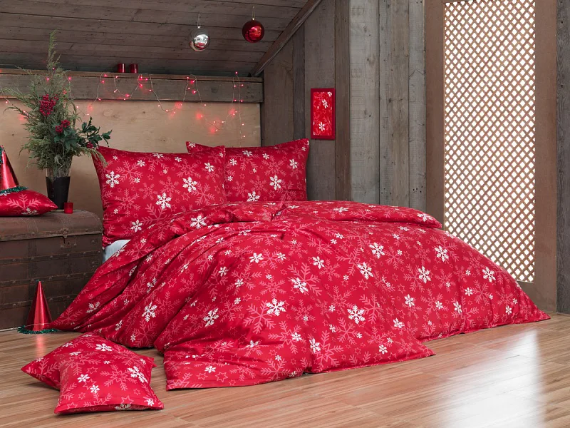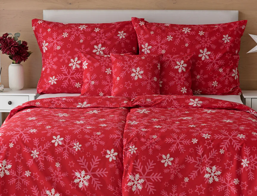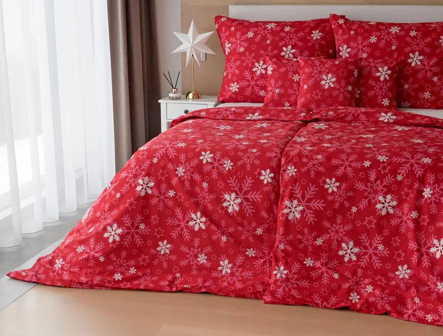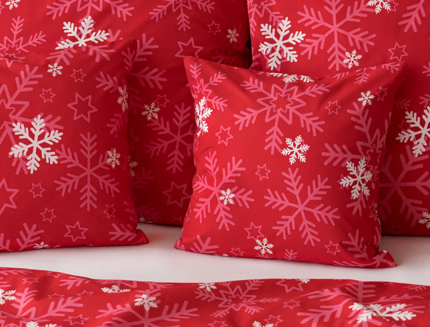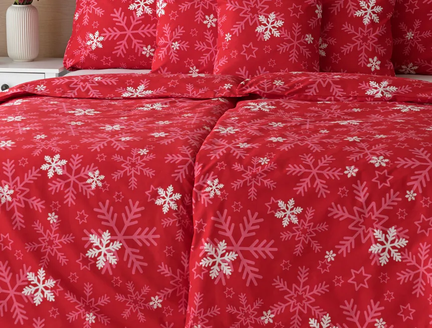Sviatočne vyzerajúci vzor posiaty snehovými vločkami prináša posteľná bielizeň VLOČKY. Sýty vianočný odtieň červenej farby posiaty snehovými vločkami rozžiari každý interiér. Obliečka na prikrývku aj na vankúš je z oboch strán rovnaká.