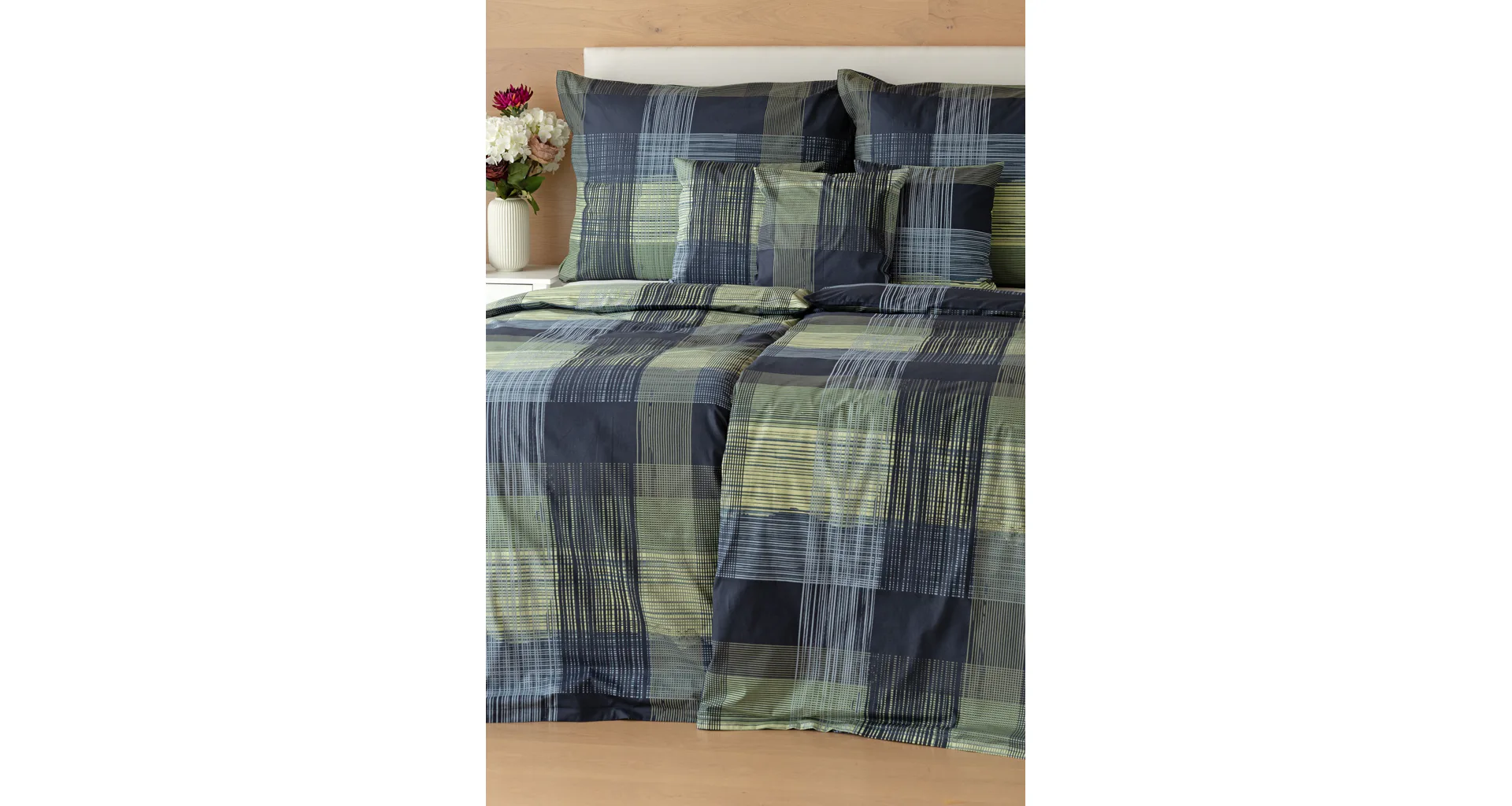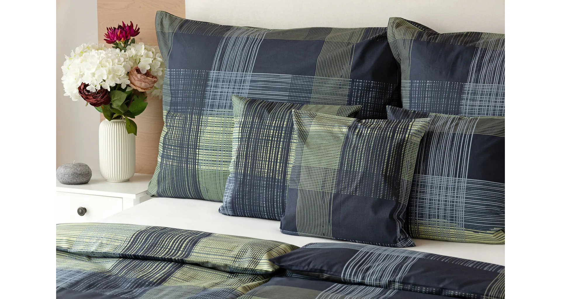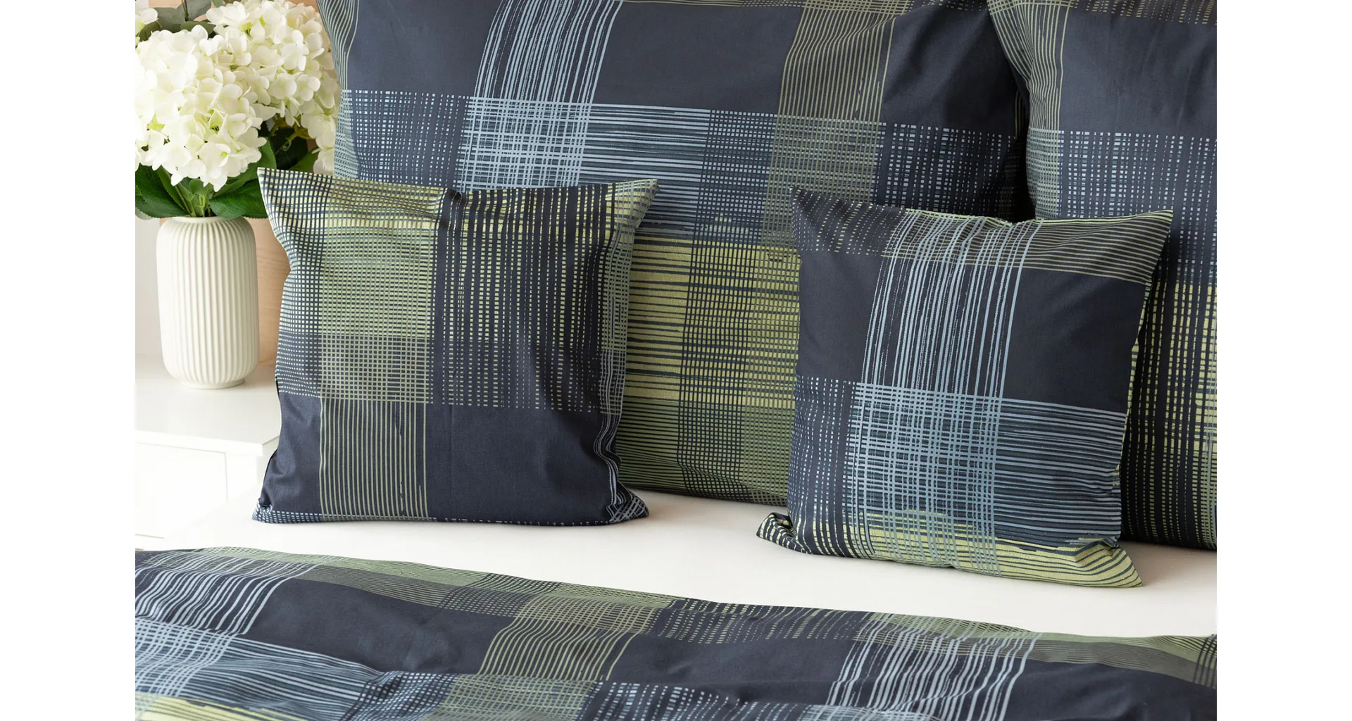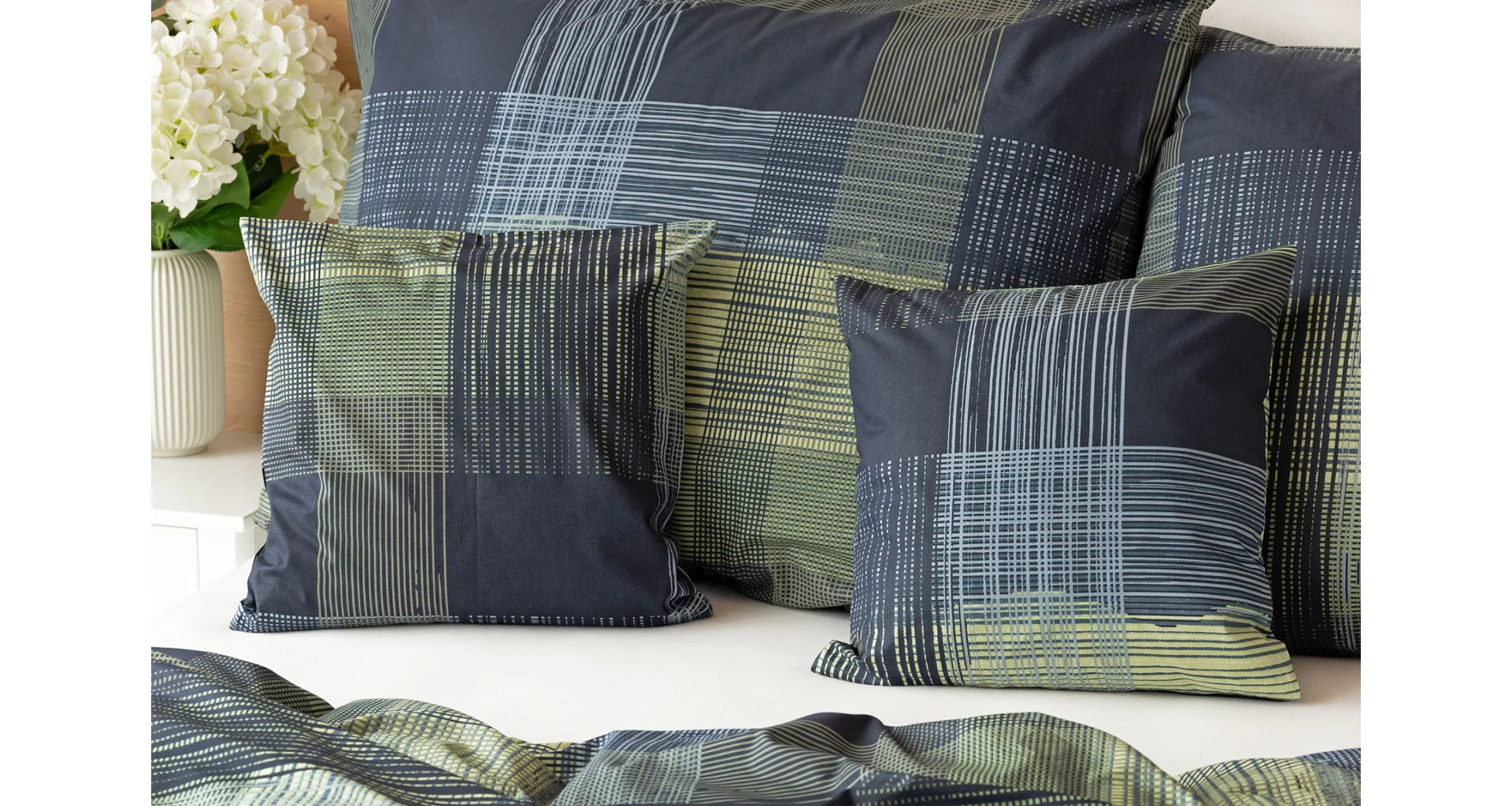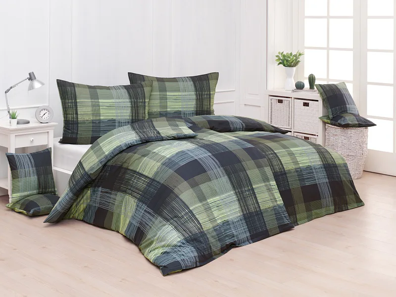 Dokonalé spojenie farieb v elegantnom vzore prinášajú bavlnené obliečky Wilson. Výsledný károvaný motív tvorený jemnými prúžkami kombinuje rozmanitú škálu tónov pistáciovo zelenej, modrej a antracitovej. Vzor je ako stvorený pre mužov, ktorý ocení každá praktická žena.