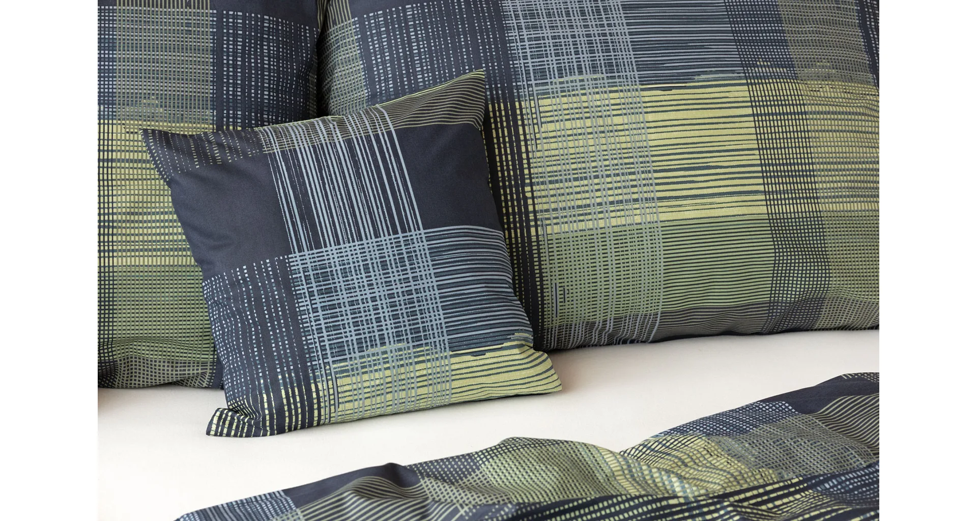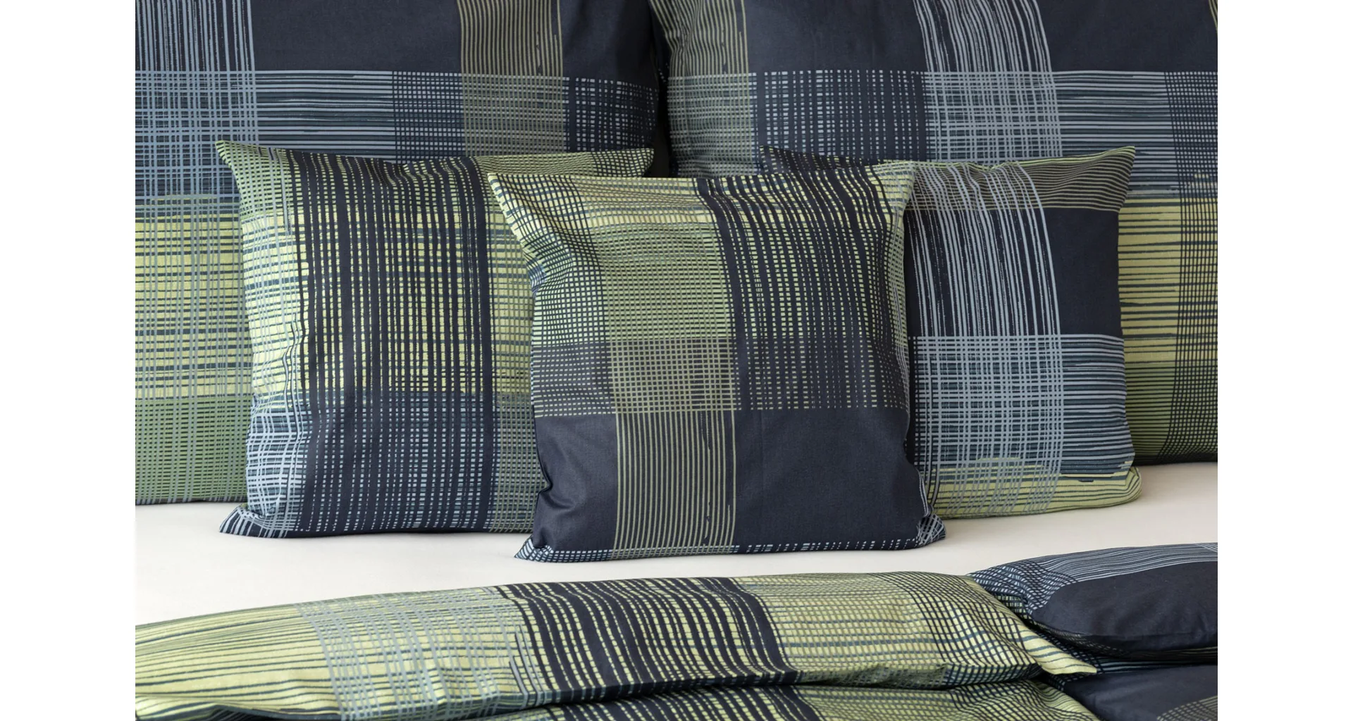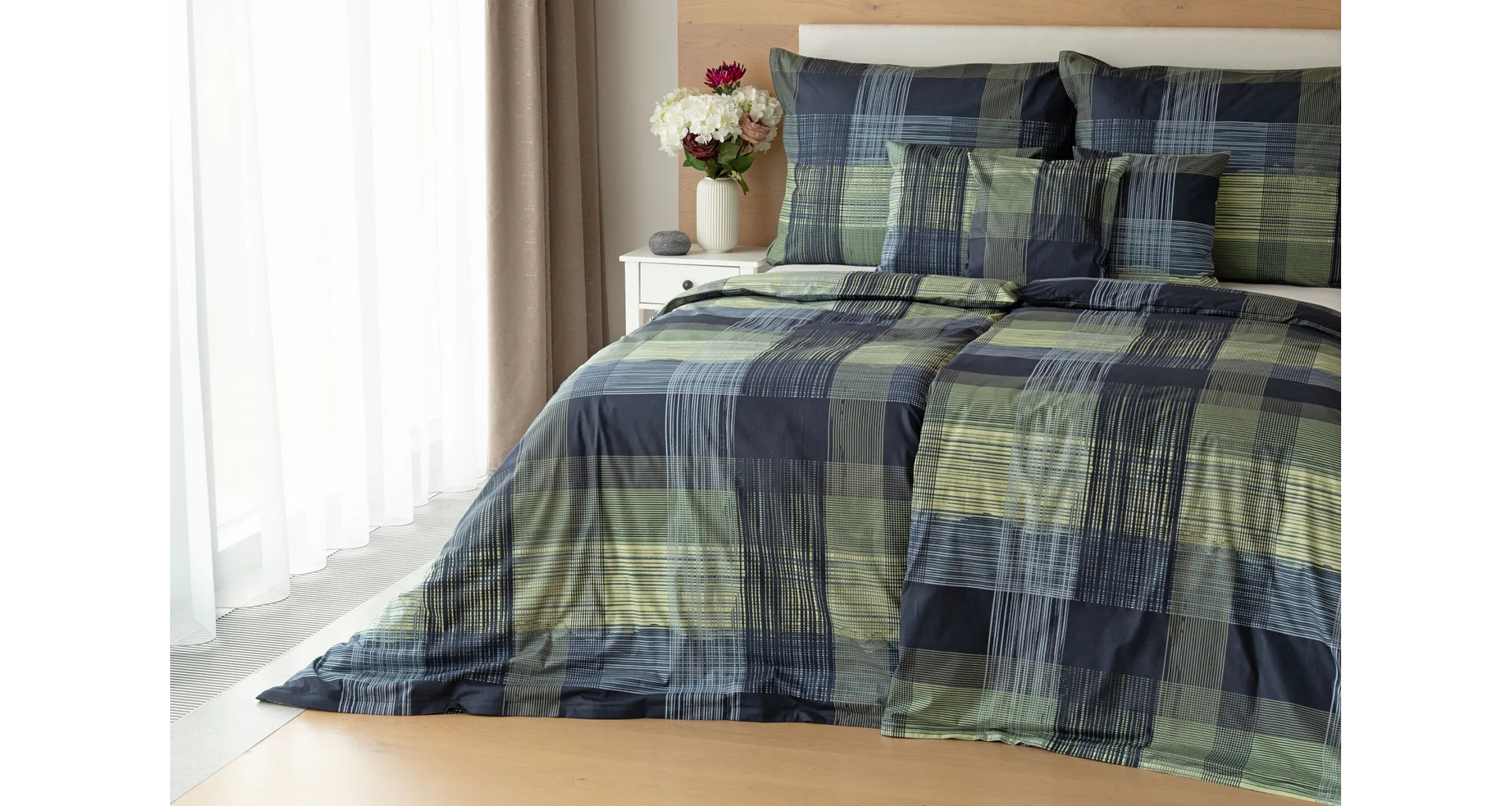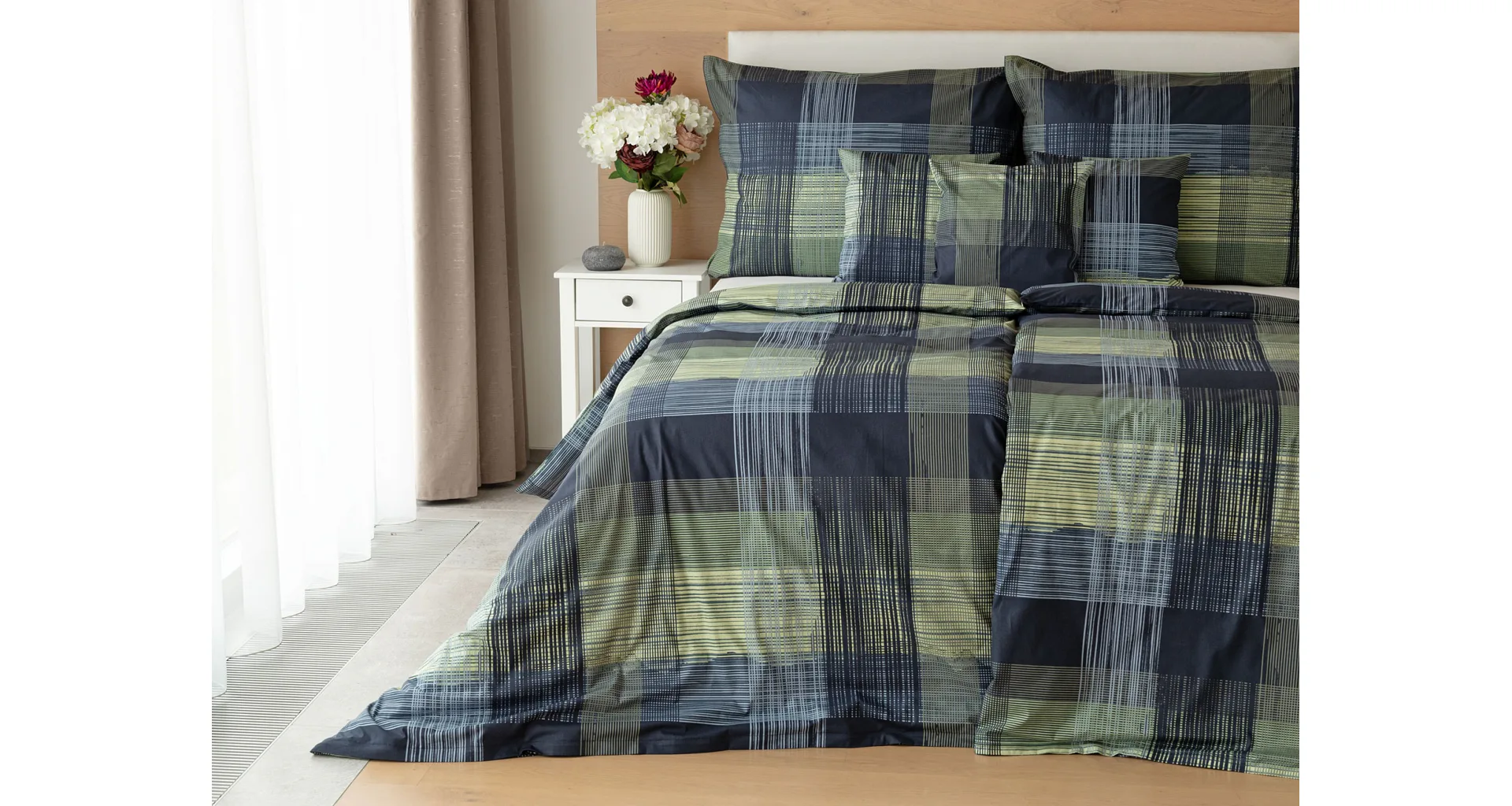 Dokonalé spojenie farieb v elegantnom vzore prinášajú bavlnené obliečky Wilson. Výsledný károvaný motív tvorený jemnými prúžkami kombinuje rozmanitú škálu tónov pistáciovo zelenej, modrej a antracitovej. Vzor je ako stvorený pre mužov, ktorý ocení každá praktická žena.