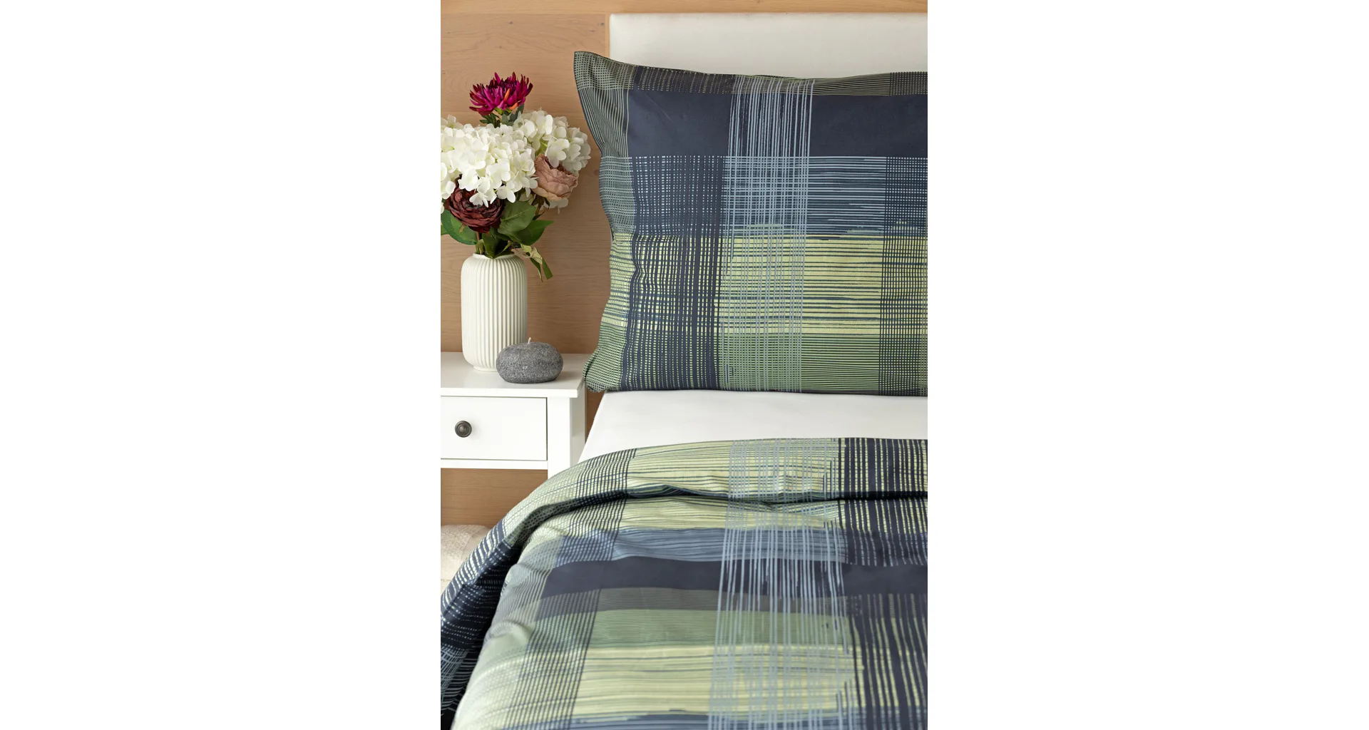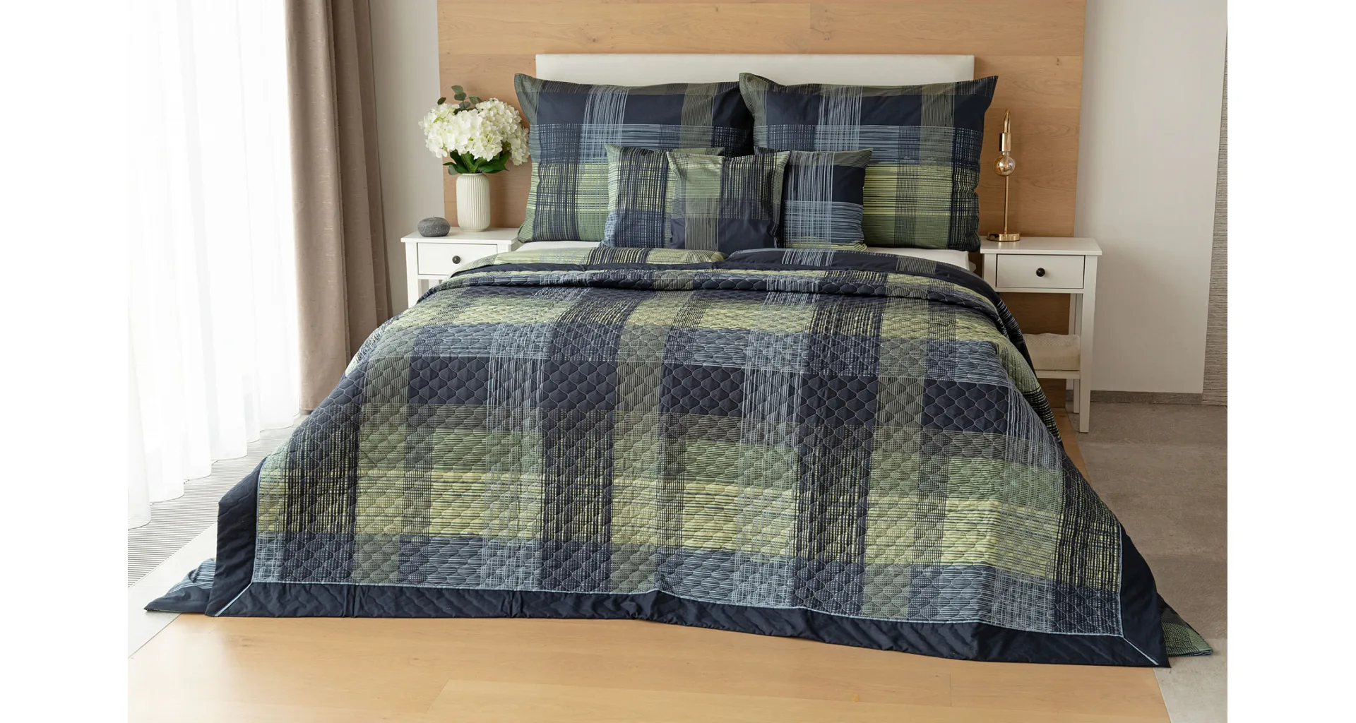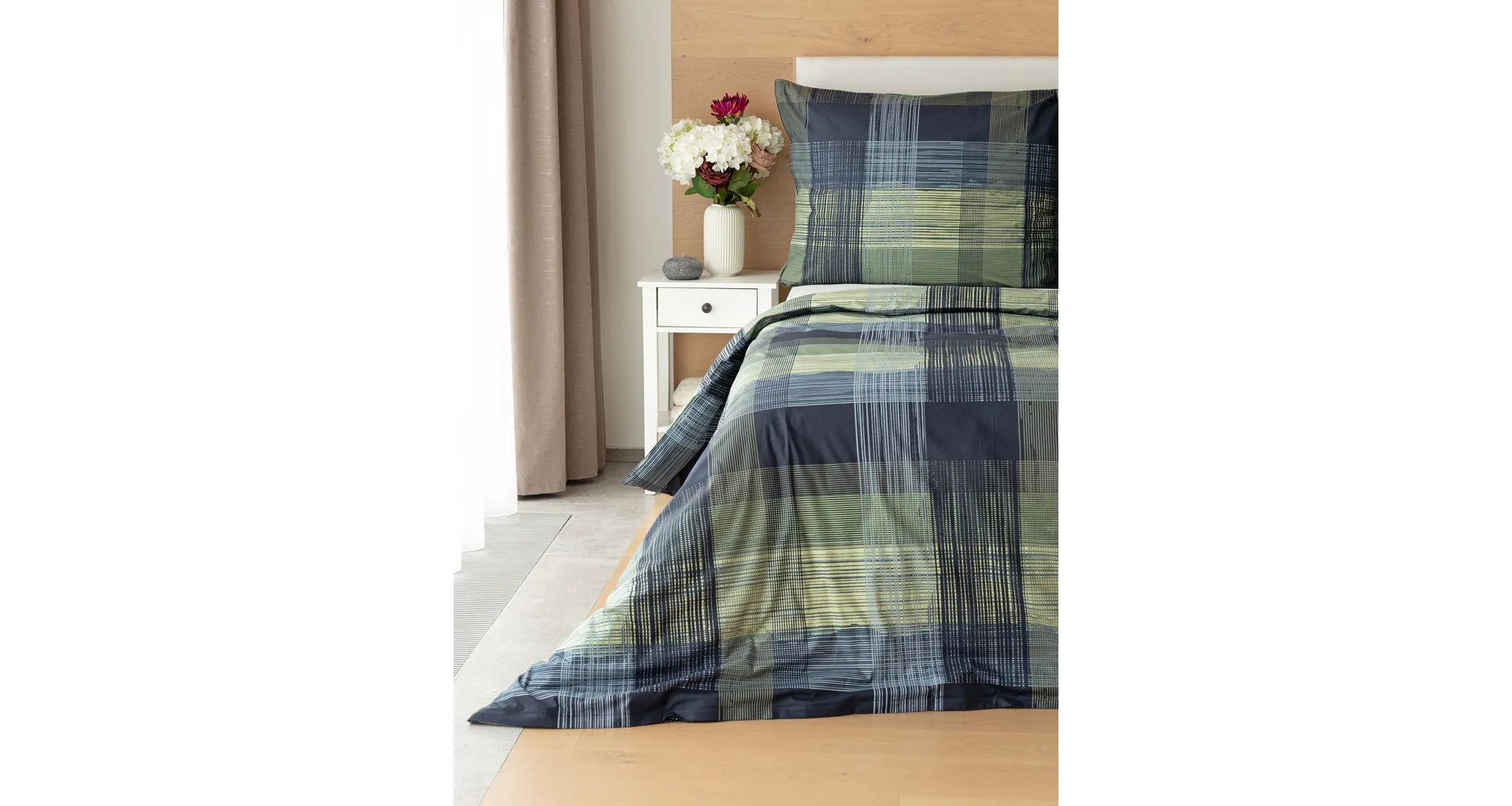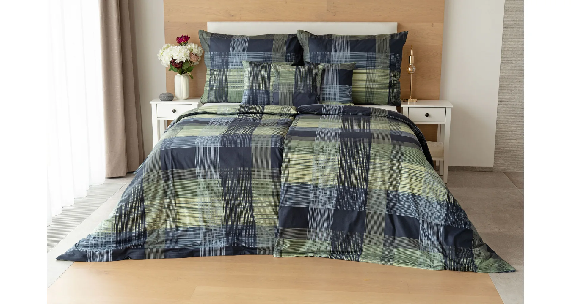 Dokonalé spojenie farieb v elegantnom vzore prinášajú bavlnené obliečky Wilson. Výsledný károvaný motív tvorený jemnými prúžkami kombinuje rozmanitú škálu tónov pistáciovo zelenej, modrej a antracitovej. Vzor je ako stvorený pre mužov, ktorý ocení každá praktická žena.