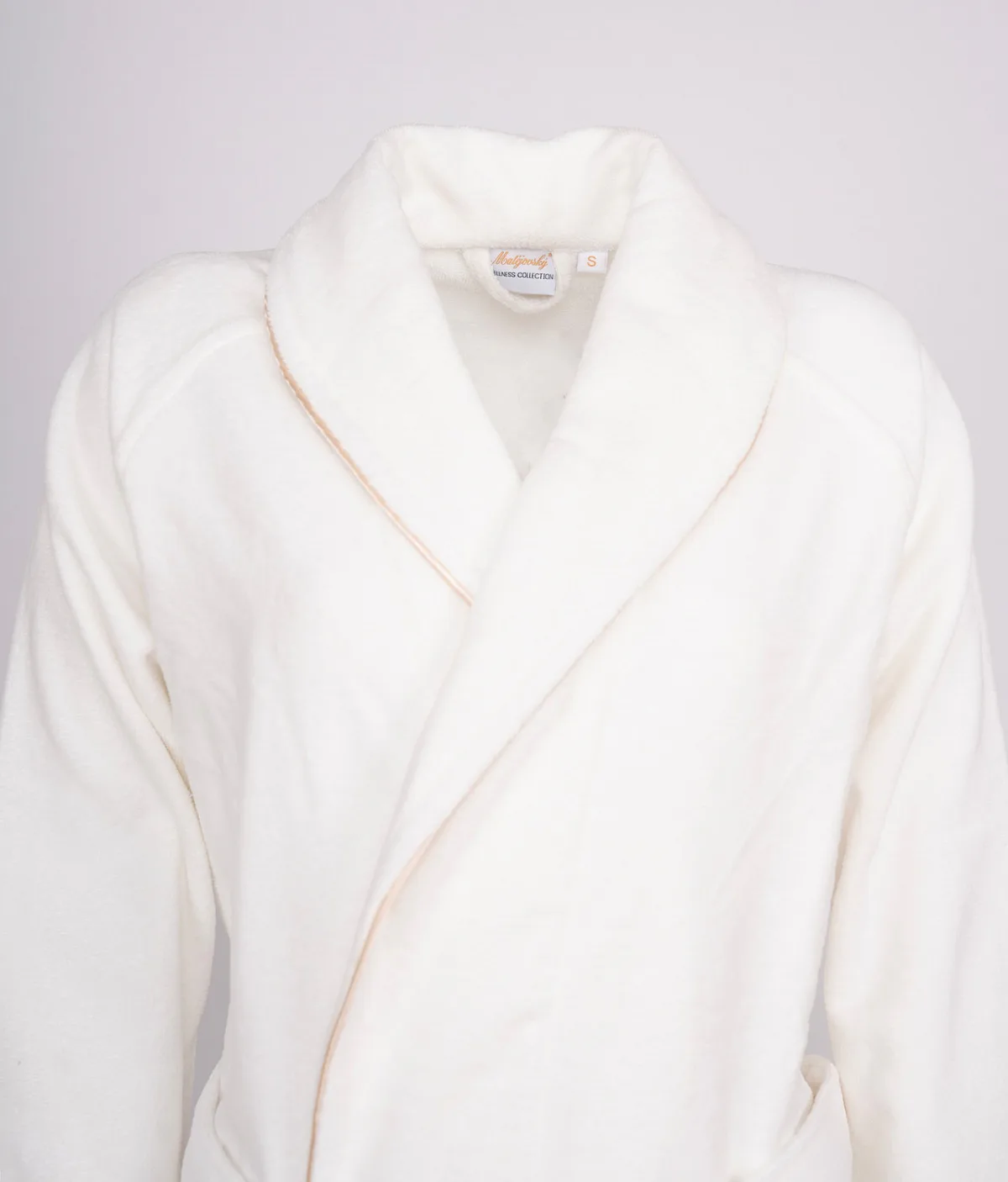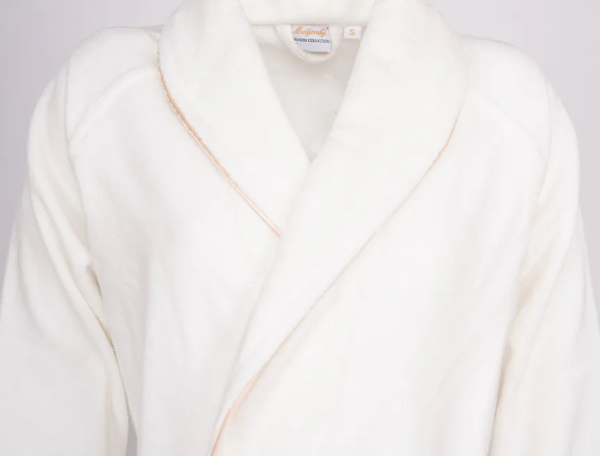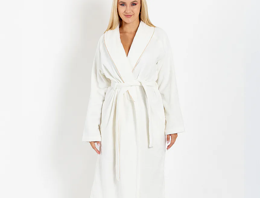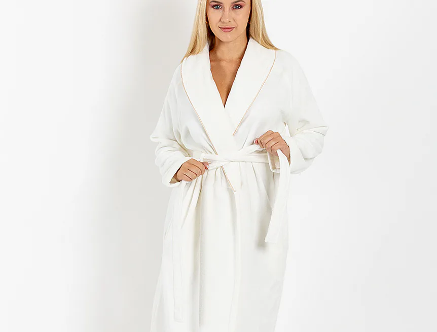 Župany jsou vyrobeny ze 100% prvotřídní bavlněné příze, povrchovou úpravu tvoří hebké velurové froté. Přírodní materiál je zárukou jedinečného komfortu, precizní zpracování zaručí dlouhou životnost výrobku. Elegantní vzhled celé kolekce podtrhují jemné pastelové barvy doplněné v čelním lemu zlatavou paspulí.