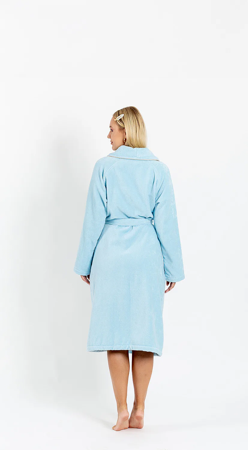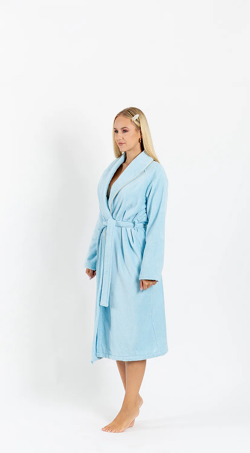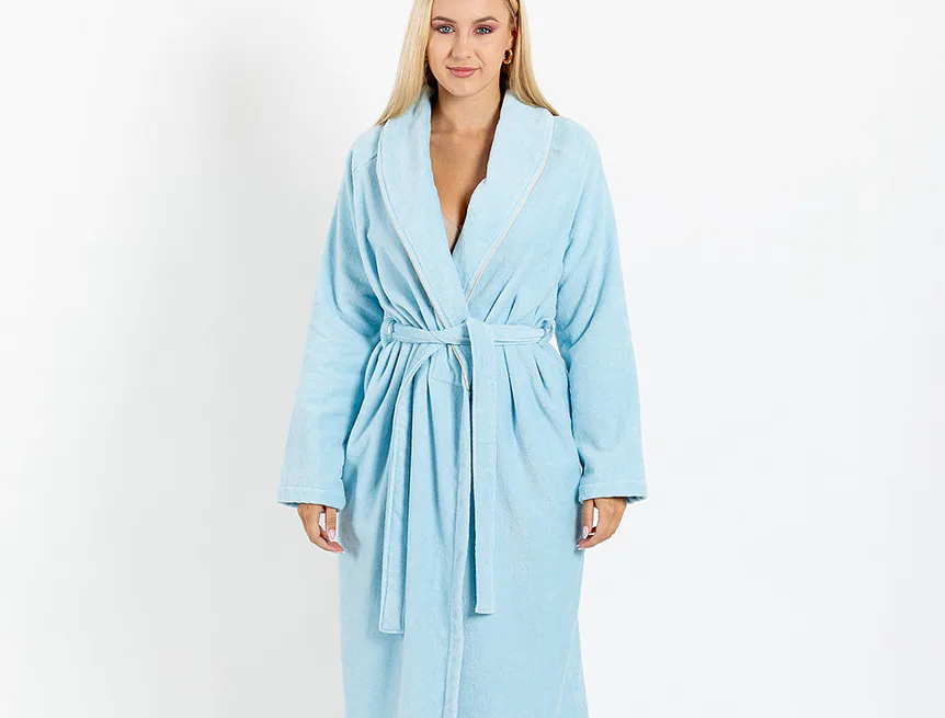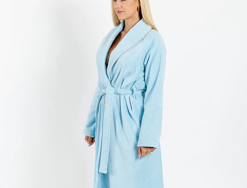 Župany jsou vyrobeny ze 100% prvotřídní bavlněné příze, povrchovou úpravu tvoří hebké velurové froté. Přírodní materiál je zárukou jedinečného komfortu, precizní zpracování zaručí dlouhou životnost výrobku. Elegantní vzhled celé kolekce podtrhují jemné pastelové barvy doplněné v čelním lemu zlatavou paspulí.
