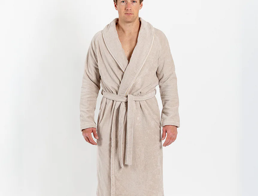 Muž na obrázku měří 182 cm a má na sobě velikost županu M.